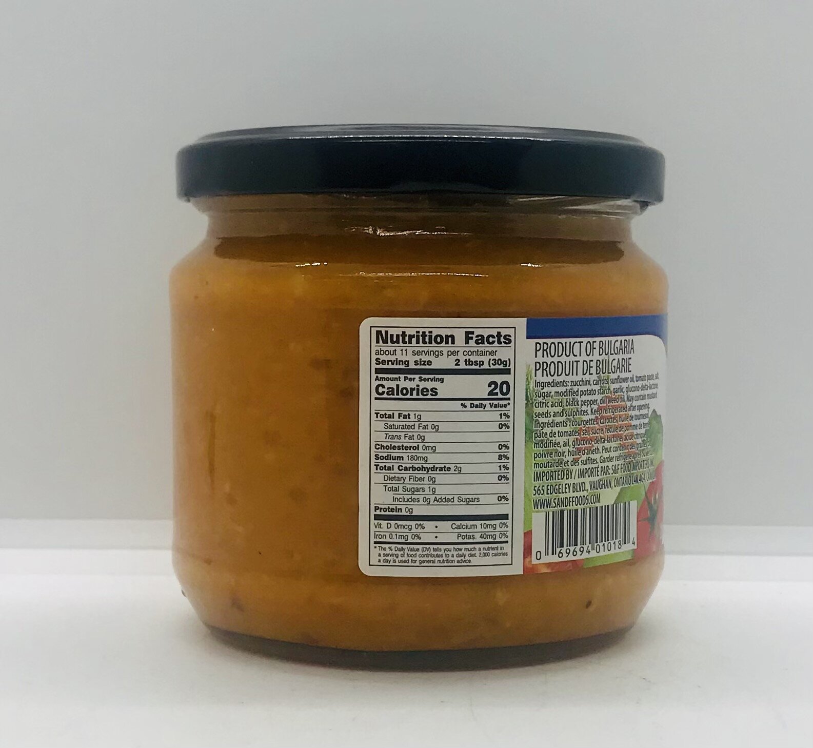 Zucchini, carrots, sunflower oil, tomato paste, salt, sugar, modified potato starch, garlic, glucono-delta-lactone, citric acid, black pepper, dill, weed oil.