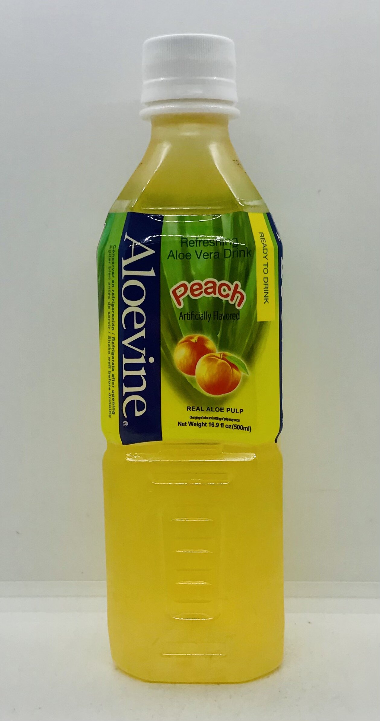 Purified water, aloe vera gel (8%), fructose, sugar, citric acid, calcium lactate, artificial peach flavor, sodium citrate, vitamin C, gellan gum, cochineal extract, turmeric extract, B-carotene.
