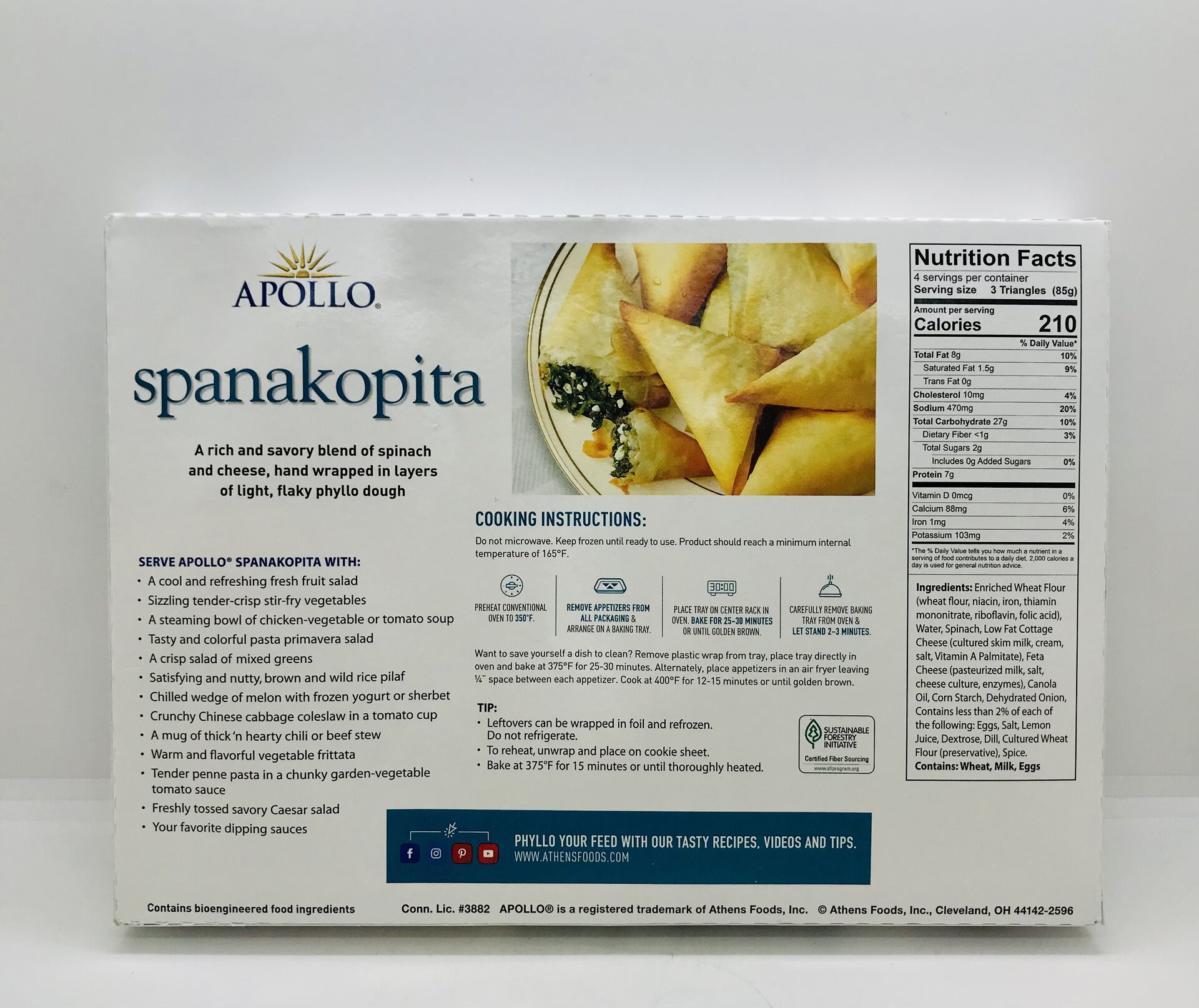 Enriched Wheat Flour (wheat flour, niacin, iron, thiamin mononitrate, riboflavin, folic acid), Water, Spinach, Low Fat Cottage Cheese (cultured skim milk, cream, salt, Vitamin A Palmitate), Feta Cheese (pasteurized milk, salt, cheese culture, enzymes), Canola Oil, Corn Starch, Dehydrated Onion, Contains less than 2% of each of the following: Eggs, Salt, Lemon Juice, Dextrose, Dill, Cultured Wheat Flour (preservative), Spice.