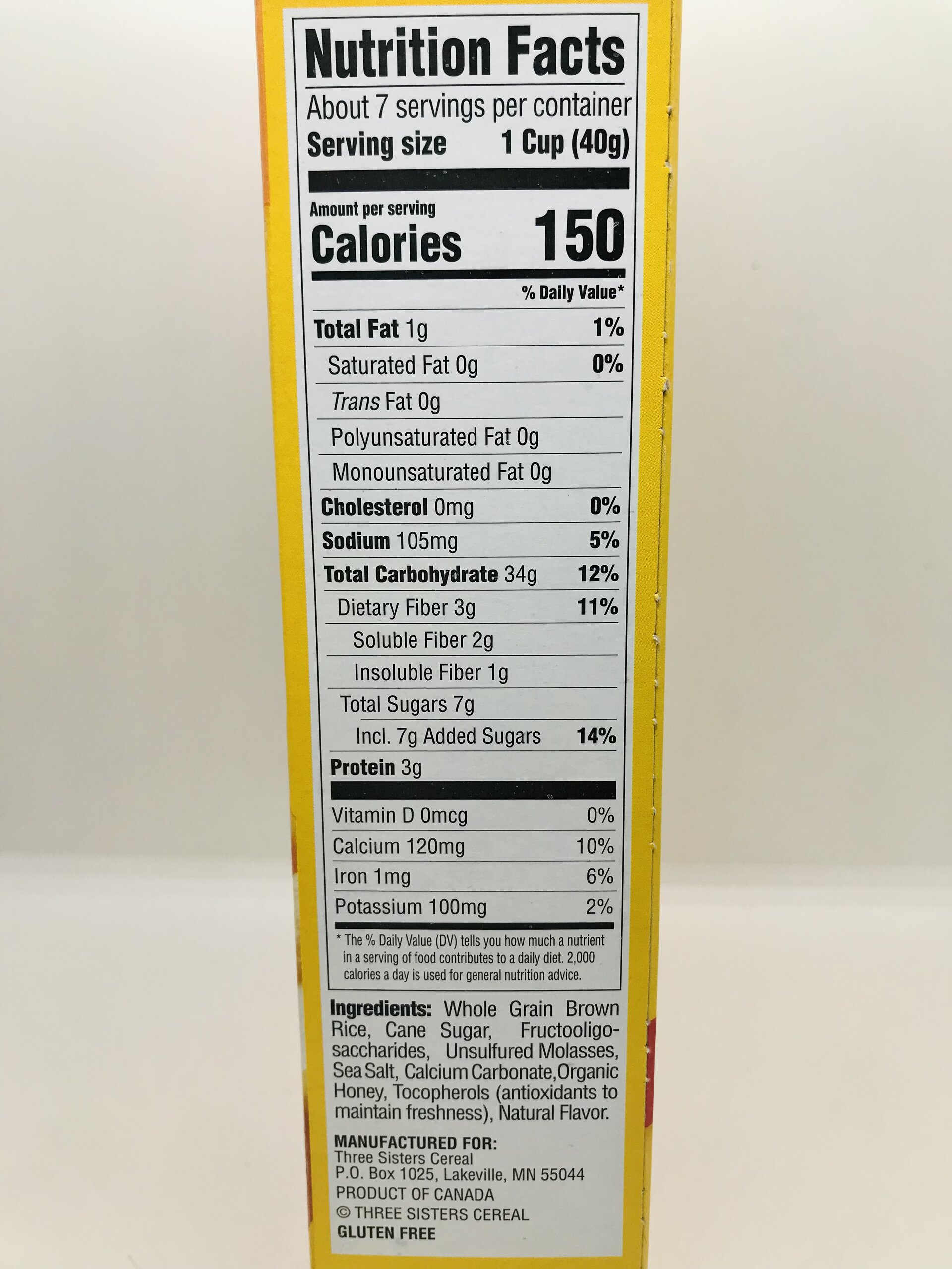 Whole grain brown rice, cane sugar, fructooligo-saccharides, Unsulfured molasses, sea salt, calcium carbonate, organic honey, tocopherols, natural flavor.