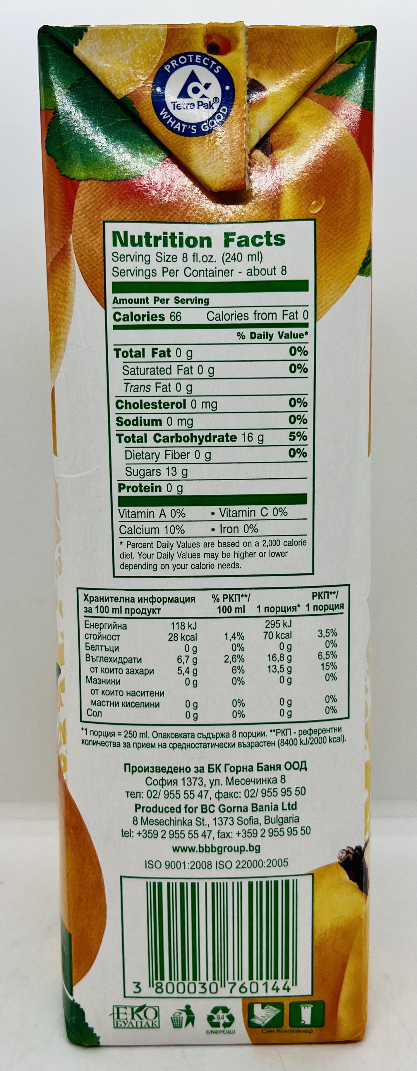 Water, apricot puree (min. 9%), sugar 52 g/l, apple puree (min. 3%), citric acid (E330), stabilizer xanthan gum (E415), emulsion apricot [stabilizer gum arabic (E414), stabilizer glycerol esters of wood raisins (E445), vegetable oil, colorant beta carotene (E160a), antioxidant alpha tocopherol (E307), preservative potassium sorbate (E202), colorant beta-apo-8-carotenal (E160e), antioxidant BHT (E320)], natural flavor, antioxidant ascorbic acid (E300), sweetener acesulfame K (E950)- 140 mg/l, sweetener aspar tame (E951) -140 mg/l.