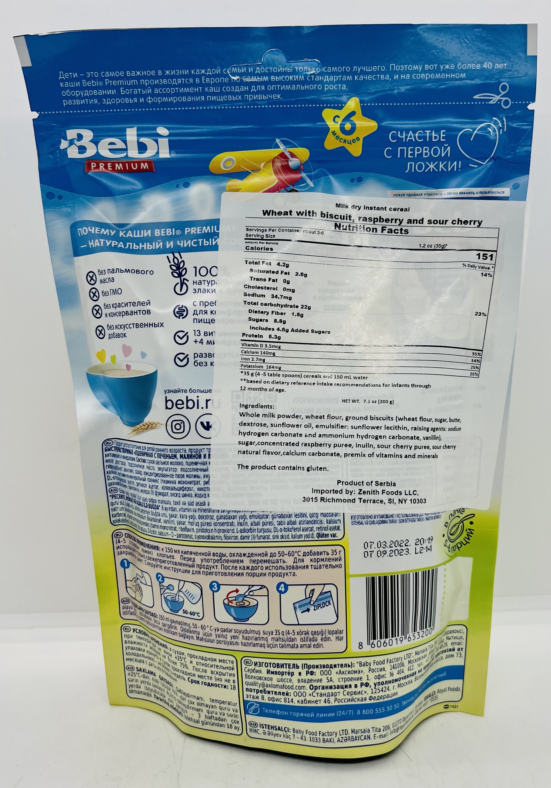 Whole milk powder, wheat flour, ground biscuits (wheat flour, sugar, butter, dextrose, sunflower oil, emulsifier: sunflower lecithin, raising agents: sodium hydrogen carbonate and ammonium hydrogen carbonate, vanillin), sugar, concentrated raspberry puree, inulin, sour cherry puree, sour cherry natural flavor, calcium carbonate, premix of vitamins and minerals.