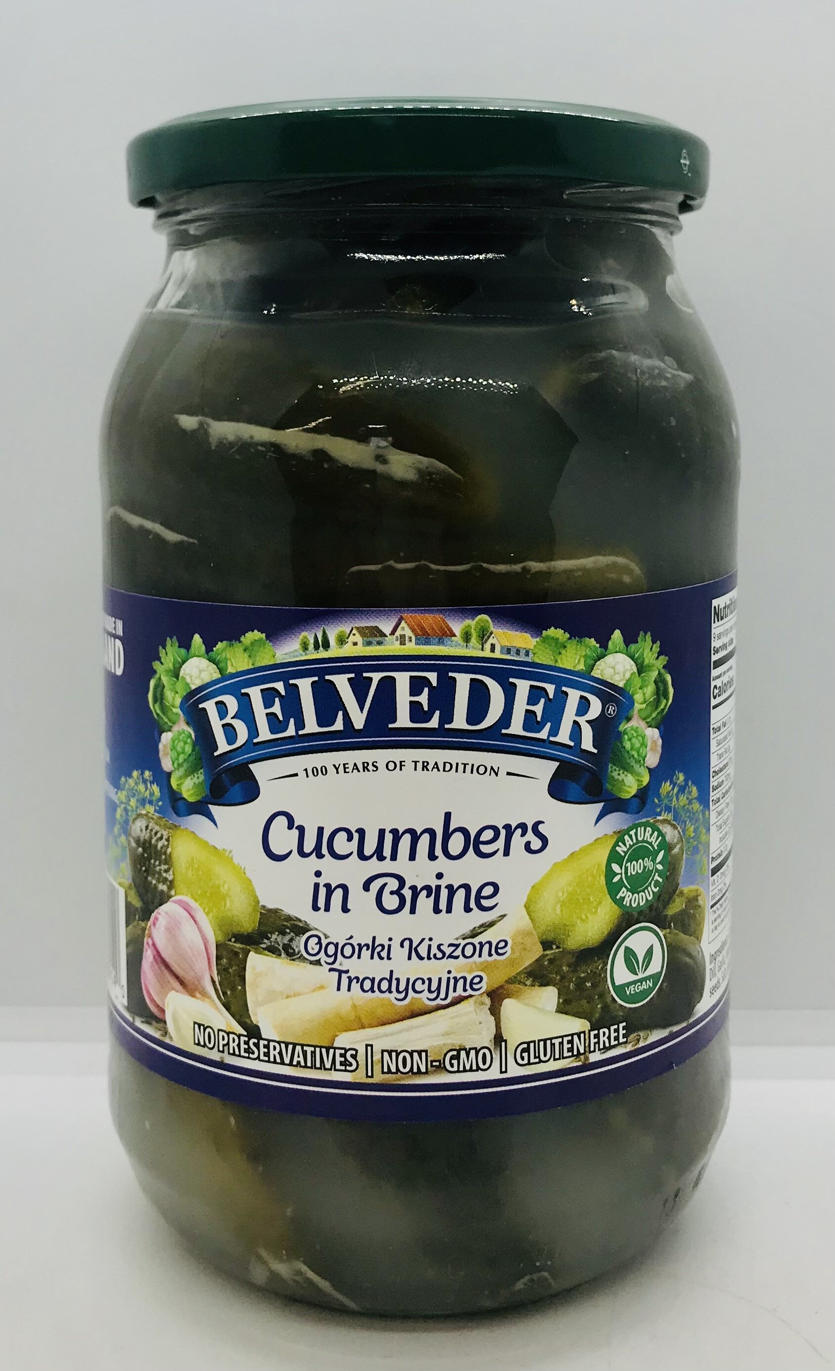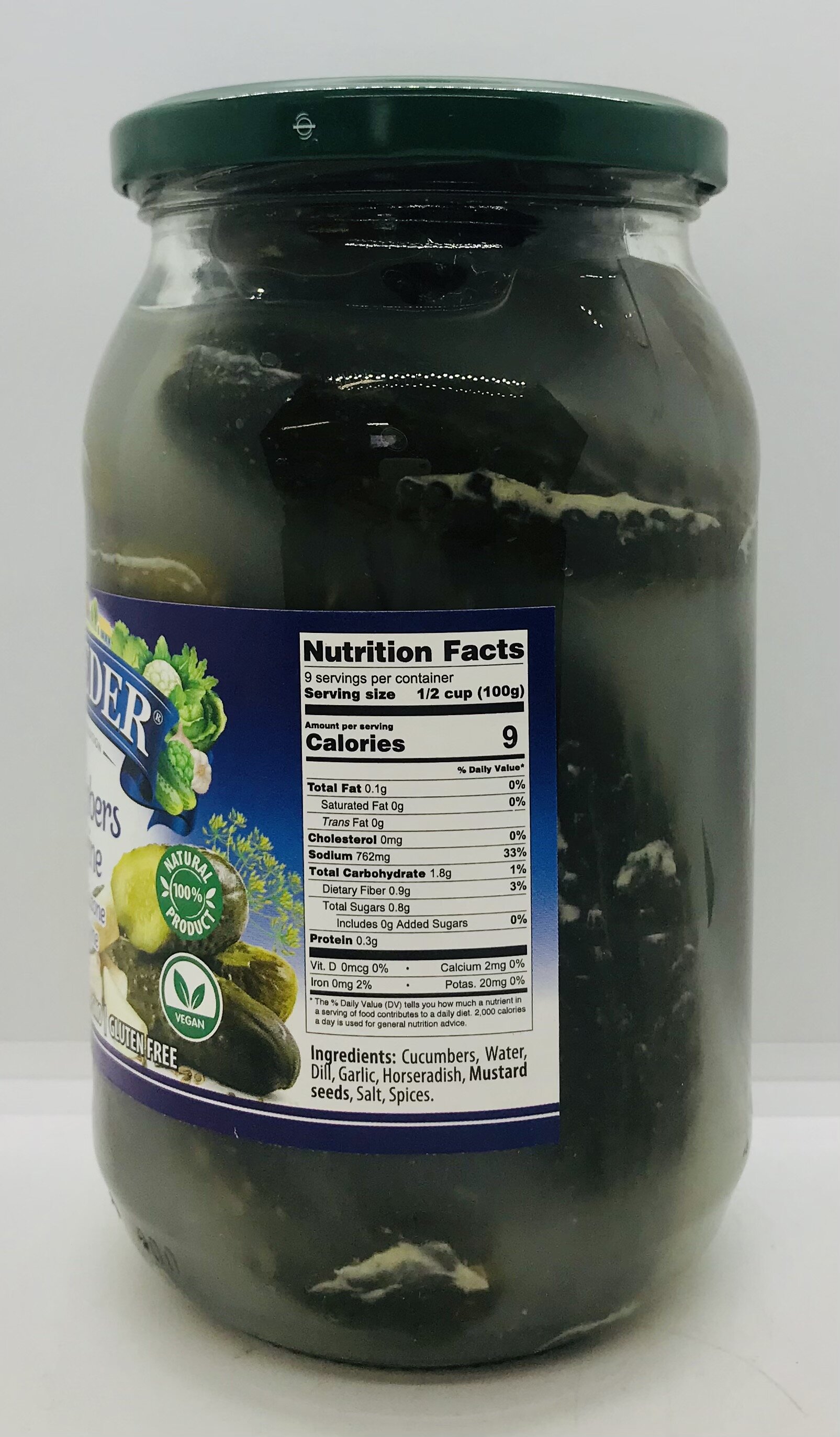 Cucumbers, water, dill, garlic, horseradish, mustard seeds, salt, spices.