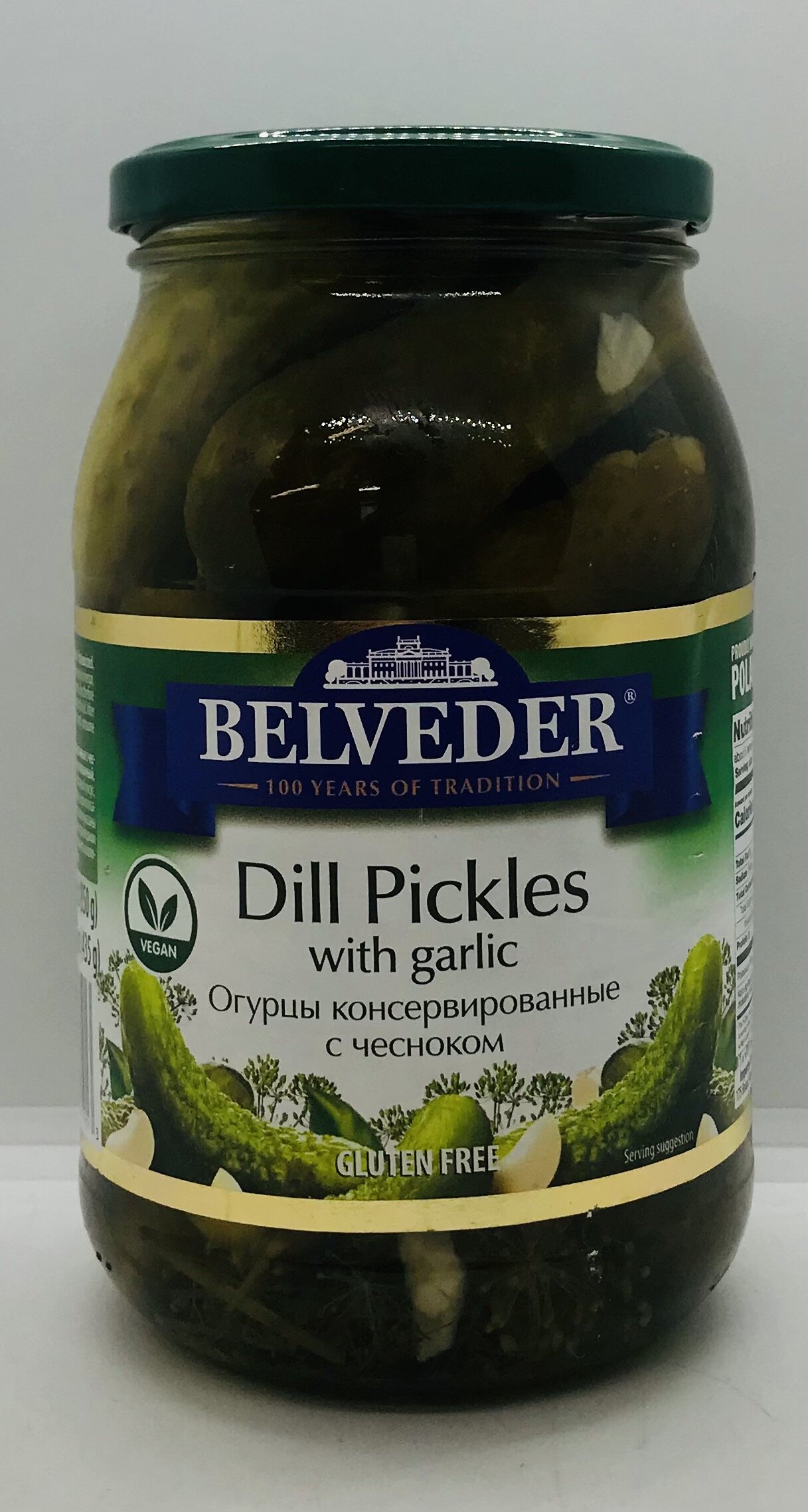 Cucumbers, water, spirit vinegar, sugar, salt, garlic, spices, aroma.
