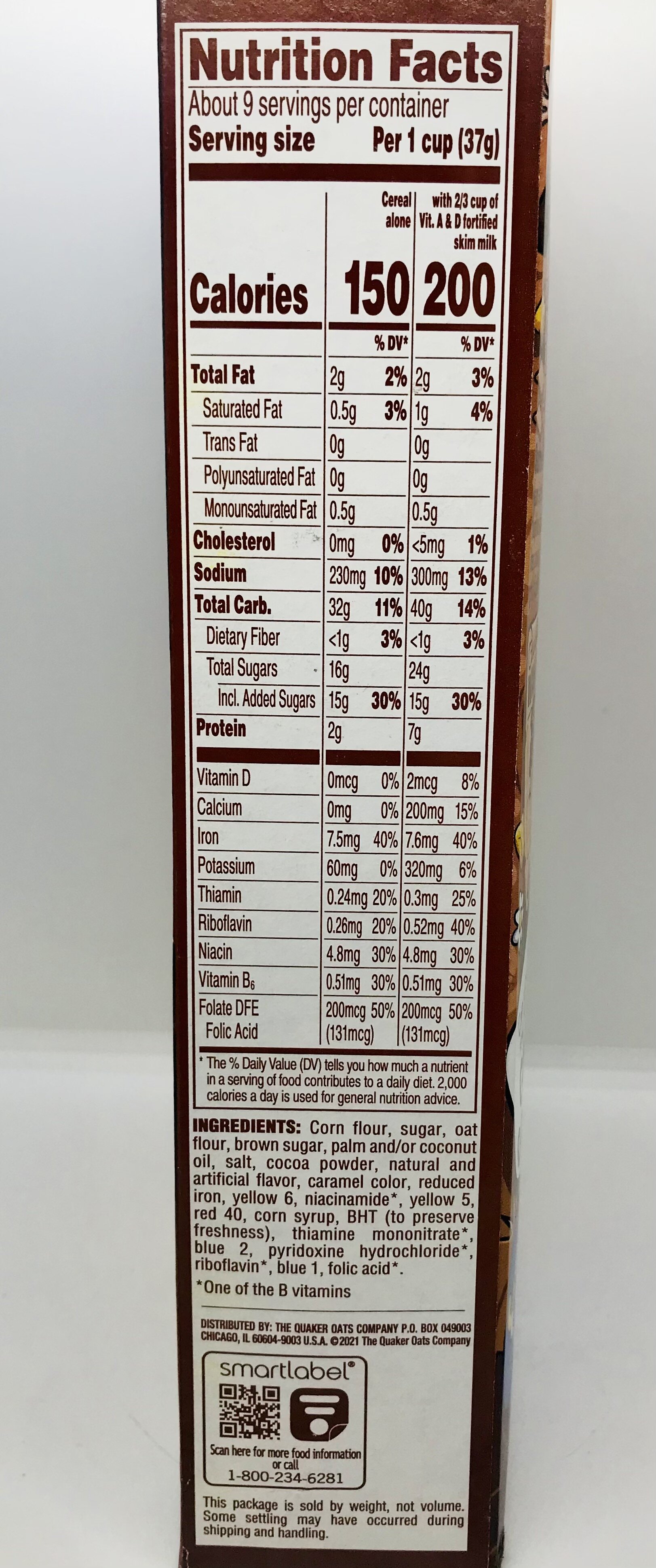 Corn flour, sugar, oat flour, brown sugar, palm oil and/or coconut oil, salt, cocoa powder, natural and artificial flavor, caramel color, reduced iron, yellow 6, niacinamide, yellow 5, thiamine mononitrate, BHT (to preserve freshness), blue 2, pyridoxine hydrochloride, riboflavin, blue 1, folic acid.