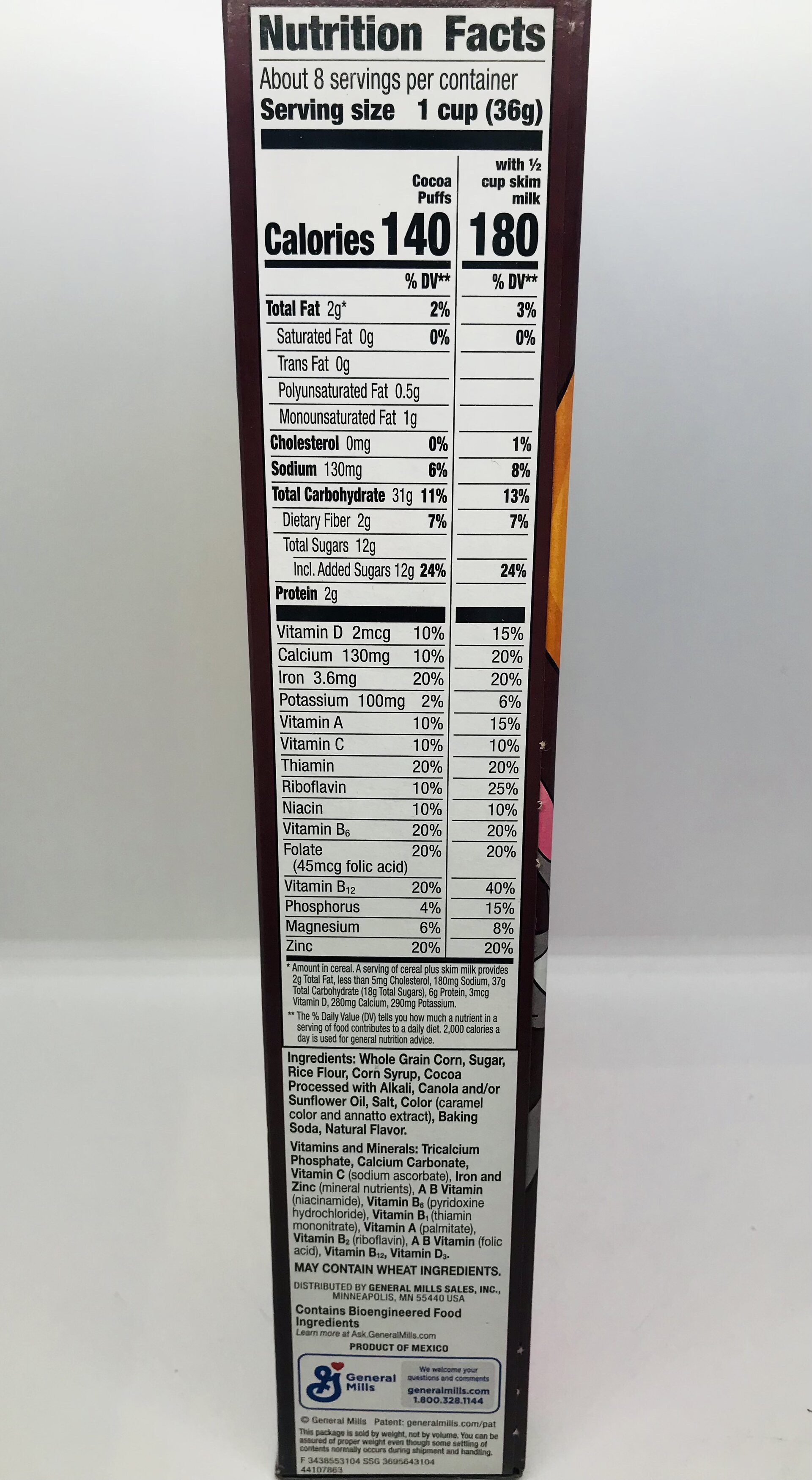 Whole grain corn, sugar, rice flour, corn syrup, cocoa processed with alkali, canola and/or sunflower oil, salt, color, baking soda, natural flavor.