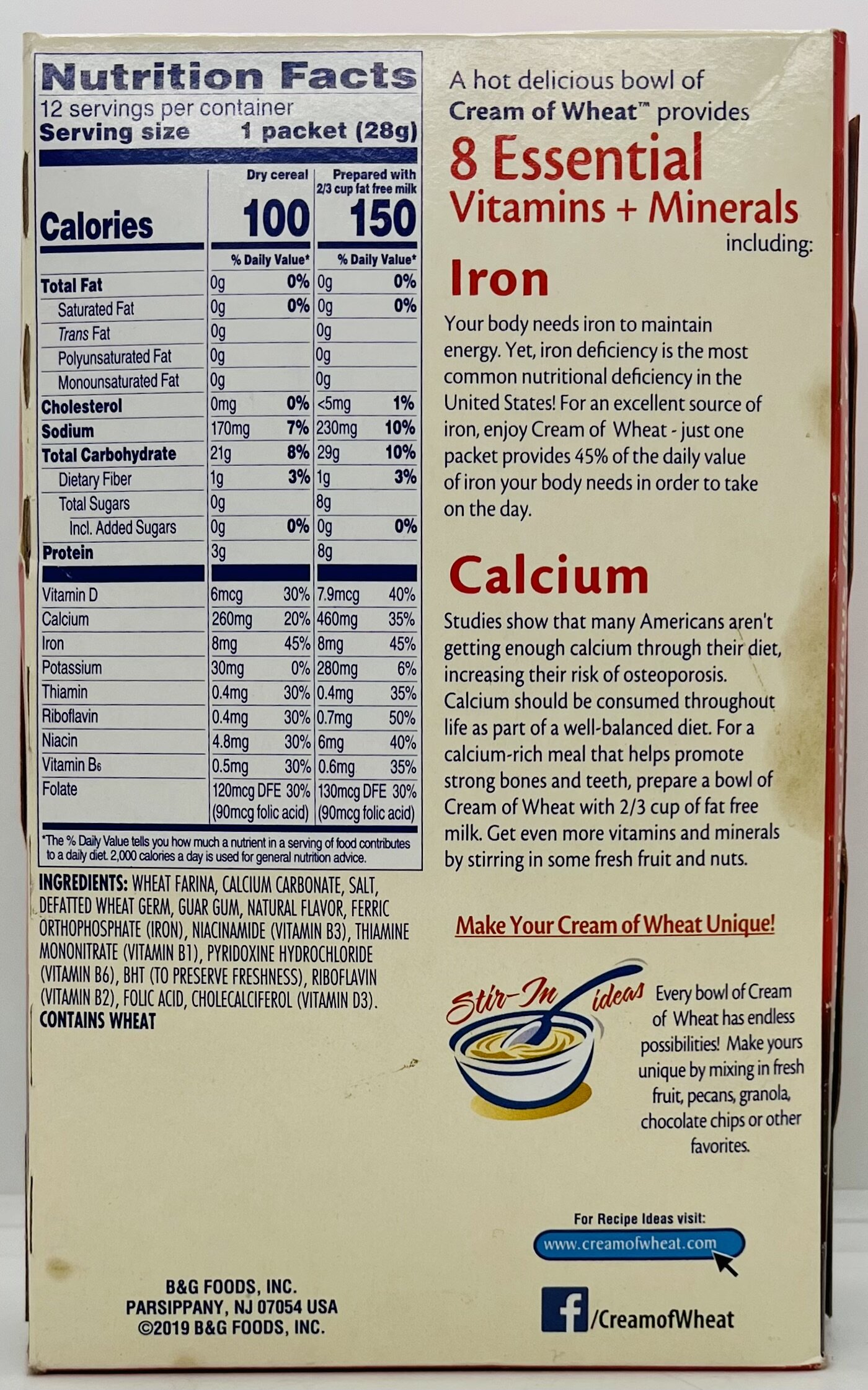 Wheat farina, calcium carbonate, salt, defatted wheat germ, guar gum, natural flavor, ferric orthophosphate, vitamin B3, Thiamine mononitrate, pyridoxine hydrochloride, BHT, riboflavin, folic acid, cholecalciferol.