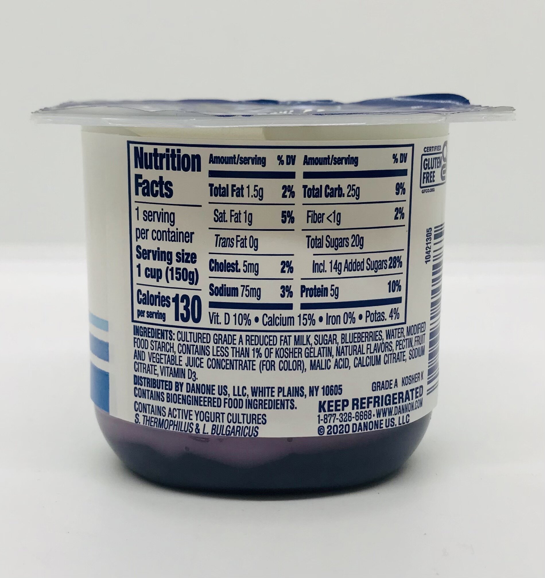 Cultured Grade A reduced fat milk, sugar, blueberries, water, modified food starch, contains less than 1% of kosher gelatin, natural flavors, pectin, fruit and vegetable juice concentrate, malic acid, calcium citrate, sodium citrate, vitamin D3.