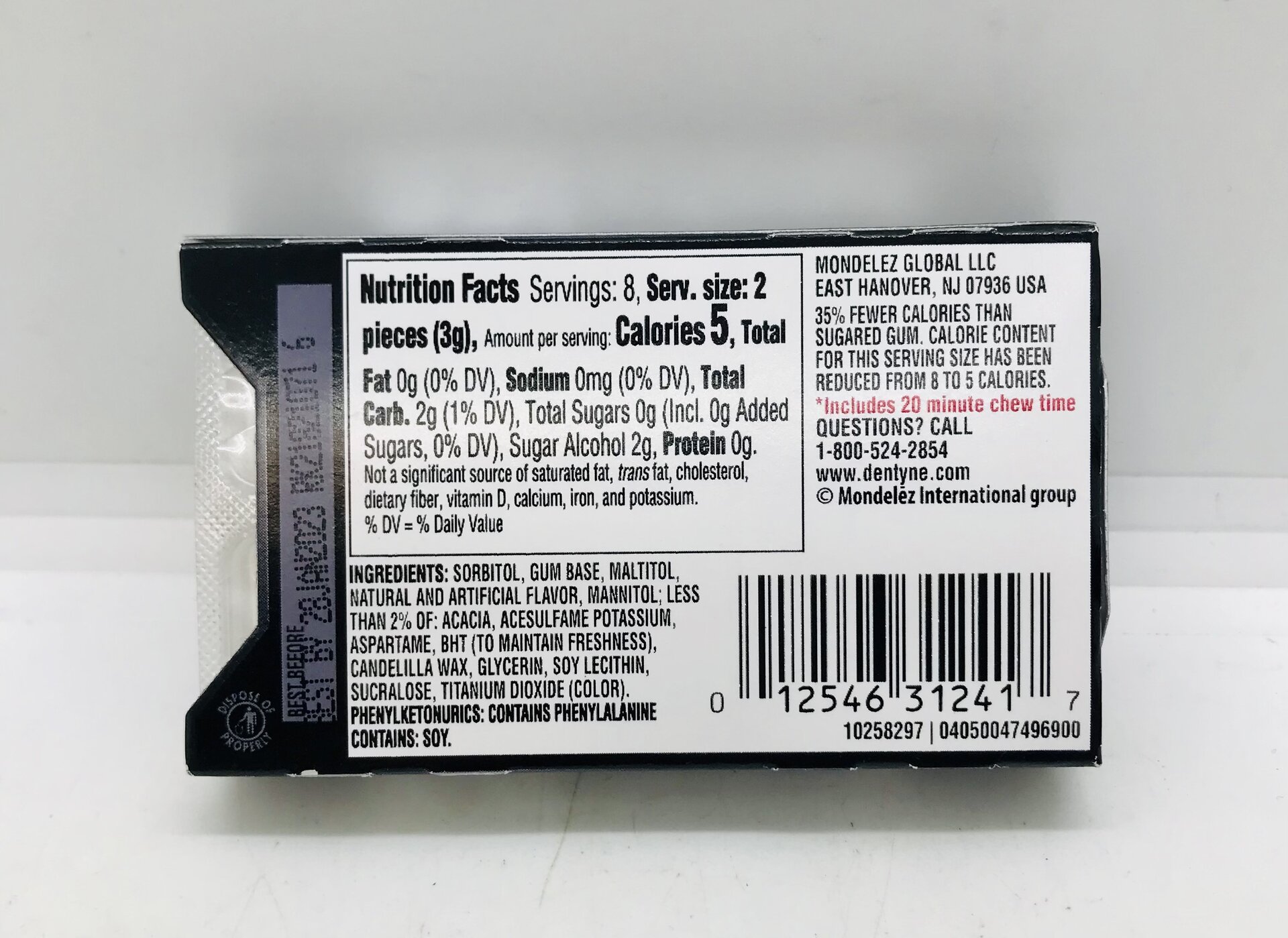 Sorbitol, gum base, maltitol, artificial and natural flavoring, mannitol; less than 2% of: acacia, acesulfame potassium, aspartame, bht (to maintain freshness), candelilla wax, glycerin, soy lecithin, sucralose, titanium dioxide (color). phenylketonurics: contains phenylalanine.