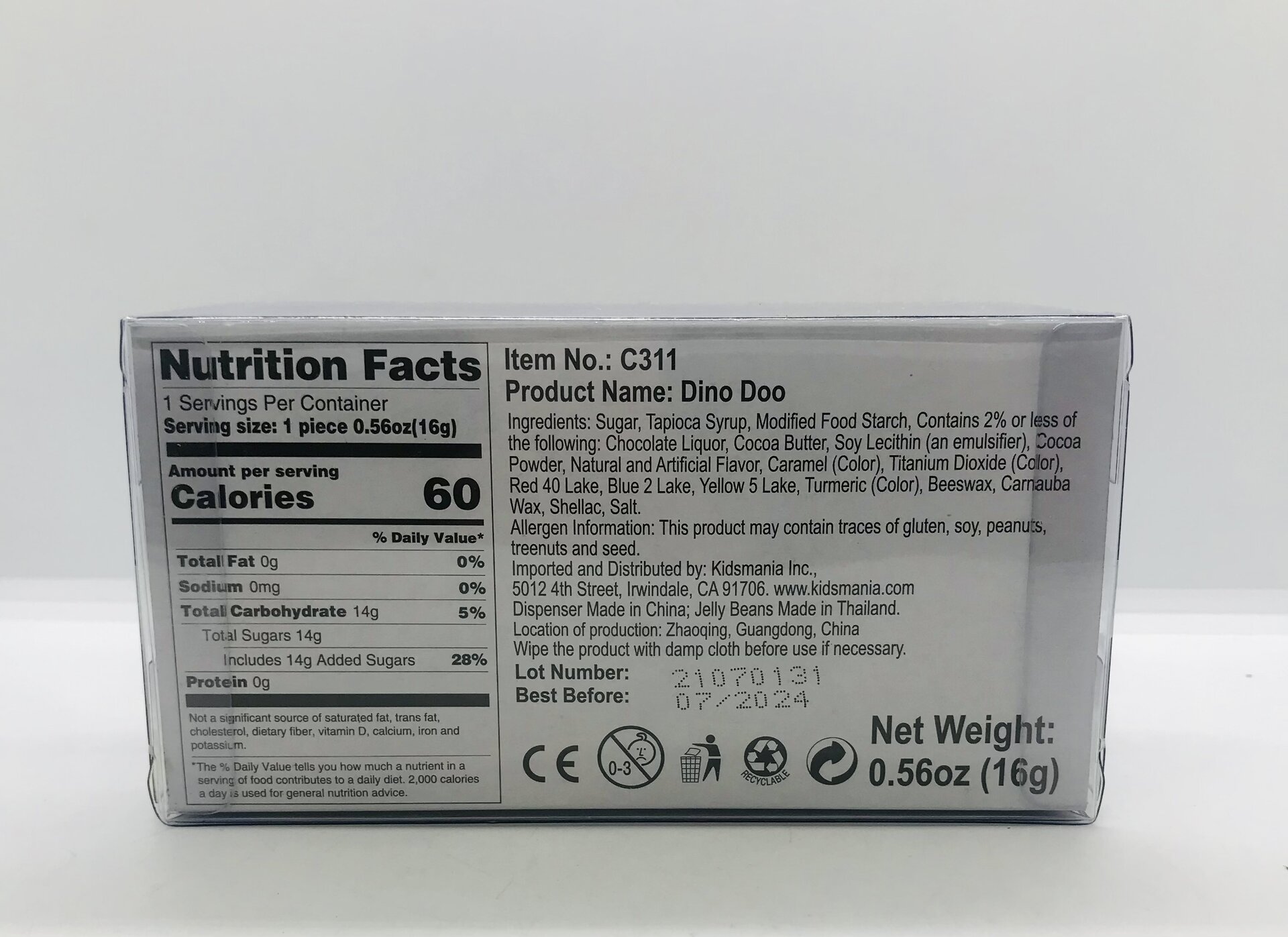 Sugar, Tapioca Syrup, Modified Food Starch, Contains 2% or less of the following: Chocolate Liquor, Cocoa Butter, Soy Lecithin (an emulsifier), Cocoa Powder, Natural and Artificial Flavor, Caramel (Color), Titanium Dioxide (Color), Red 40 Lake, Blue 2 Lake, Yellow 5 Lake, Turmeric (Color), Beeswax, Camauba Wax, Shellac, Salt.
