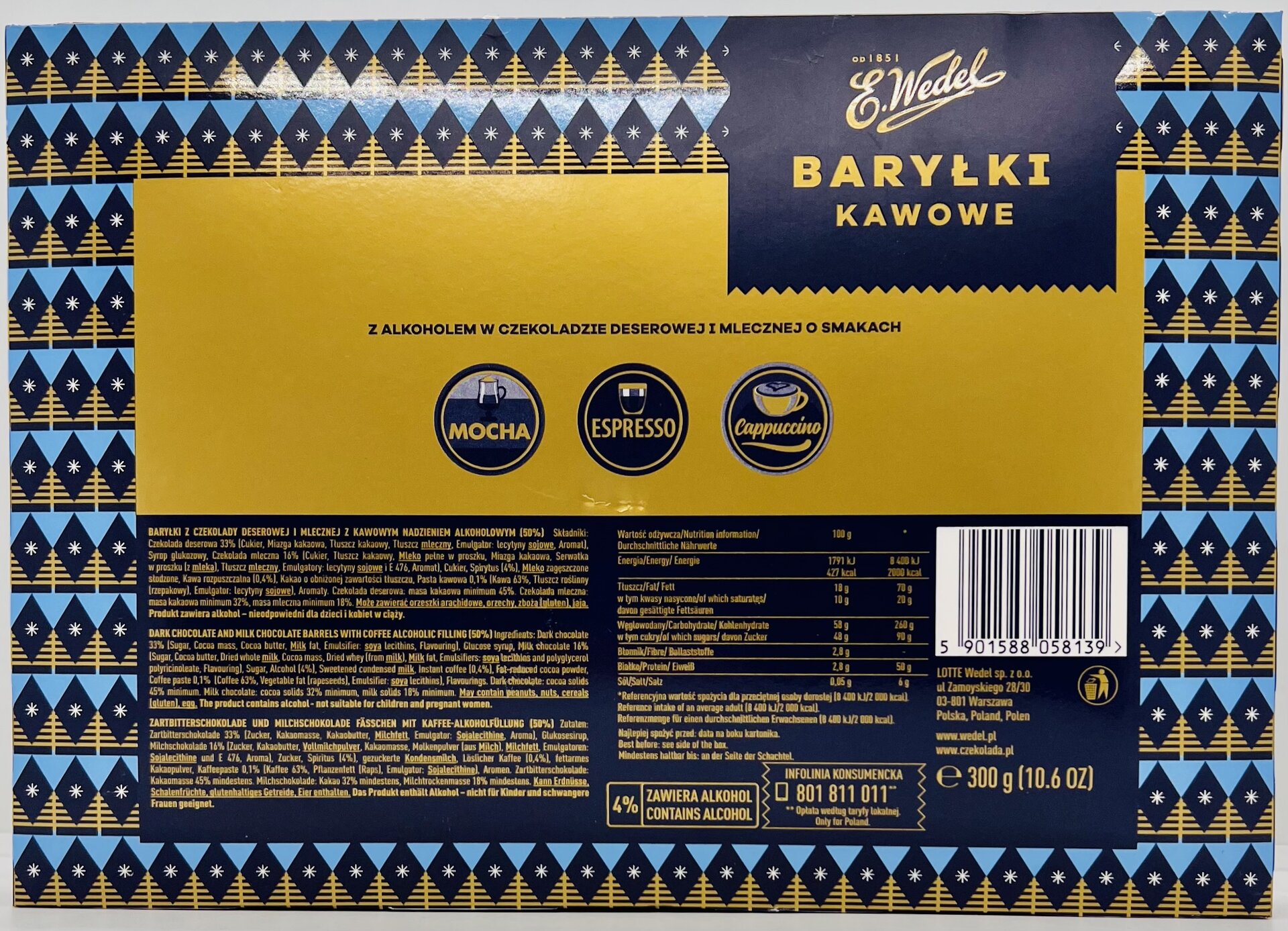 Dark chocolate 33% (Sugar, Cocoa mass, Cocoa butter, Milk fat, Emulsifier: soya lecithin's, Flavoring), Glucose syrup, Milk chocolate 16% Sugar, Cocoa butter, Dried whole milk, Cocoa mass, Dried whey (from milk), Milk fat, Emulsifiers: soya lecithin's and polyglycerol polyricinoleate, Flavoring), Sugar, Alcohol (4%), Sweetened condensed milk, Instant coffee (0,4%), Fat-calicoed cocoa powder, Coffee paste 0,1% (Coffee 63%, Vegetable fat (rapeseeds), Emulsifier, soya lecithin's), Flavorings.