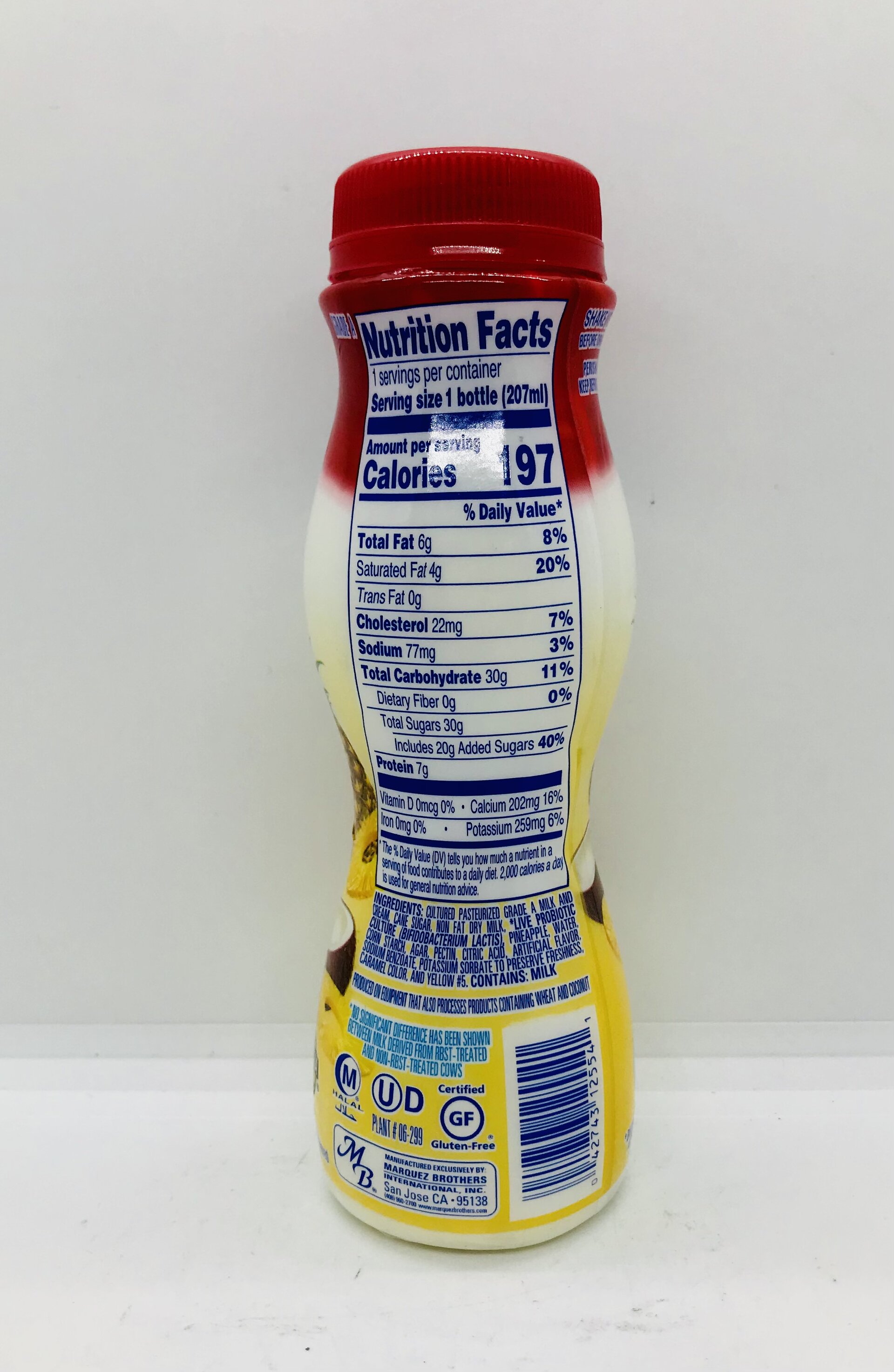 Cultured pasteurized Grade A milk and cream, cane sugar, non fat dry milk, pineapple water, corn starch, agar, pectin, citric acid, artificial flavor, sodium benzoate, potassium sorbate to preserve freshness, caramel color, and yellow 5.