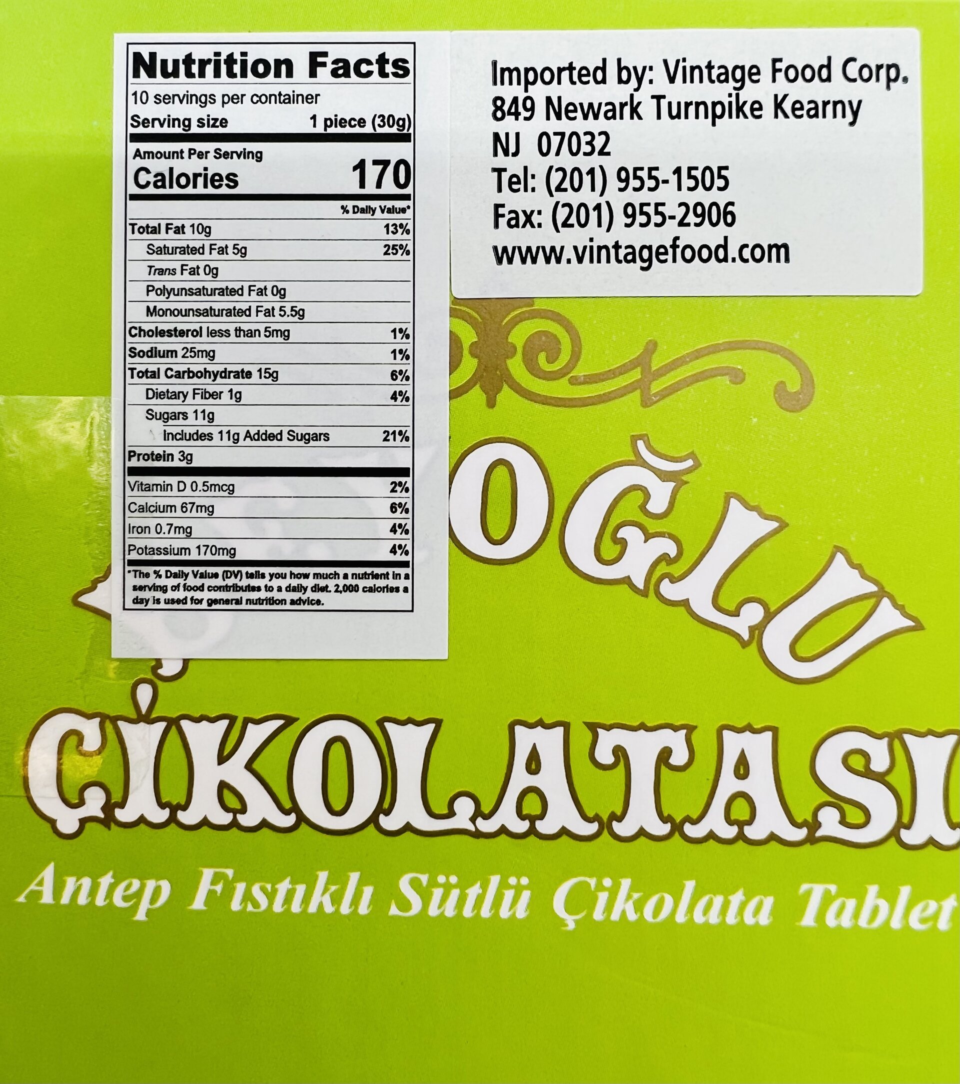 Milk chocolate (83%) (sugar, milk powder, cocoa butter, cocoa mass, emulsifier (sunflower lecithin), flavoring (vanillin), (cocoa solids min 33%)) pistachio (17%).