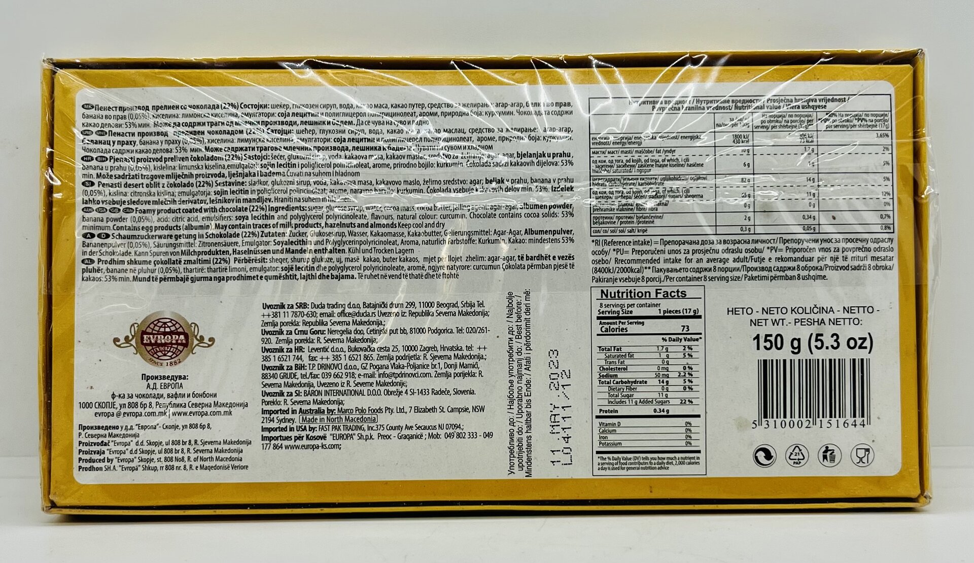 Sugar, glucose syrup, water, cocoa mass, cocoa butter, jelling agent, agar-agar, albumen powder, banana powder (0.05%), acid: citric acid, emulsifiers: soya lecithin and polyglycerol polyricinoleate, flavors, natural colour: curcumin.