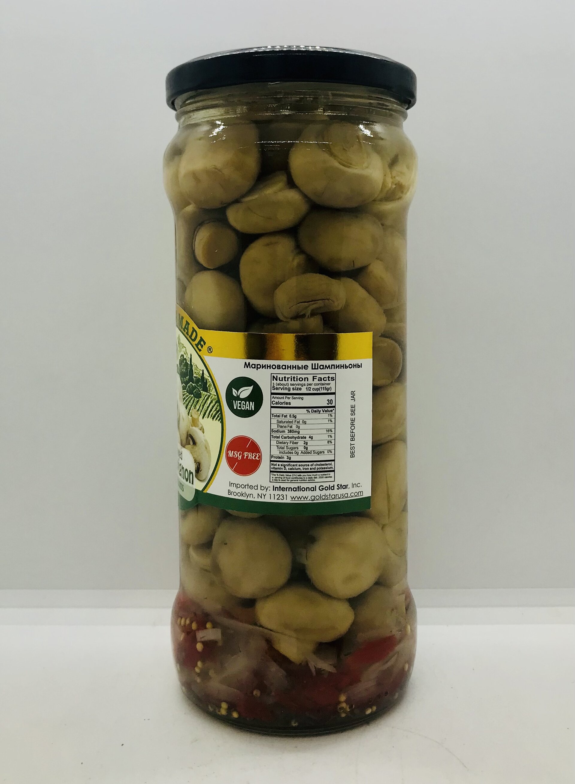 Champignon mushroom, water, onion, garlic, black pepper seed, chili pepper, mustard seed, dill, bay leaf, salt, sugar, citric acid, acetic acid, ascorbic acid.