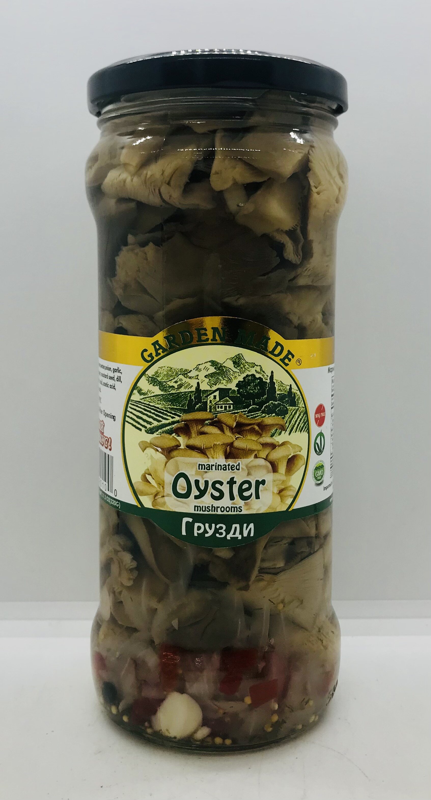 Oyster mushroom, water, onion, garlic, black pepper seed, chili pepper, mustard seed, dill, bay leaf, salt, sugar, citric acid, acetic acid, ascorbic acid.