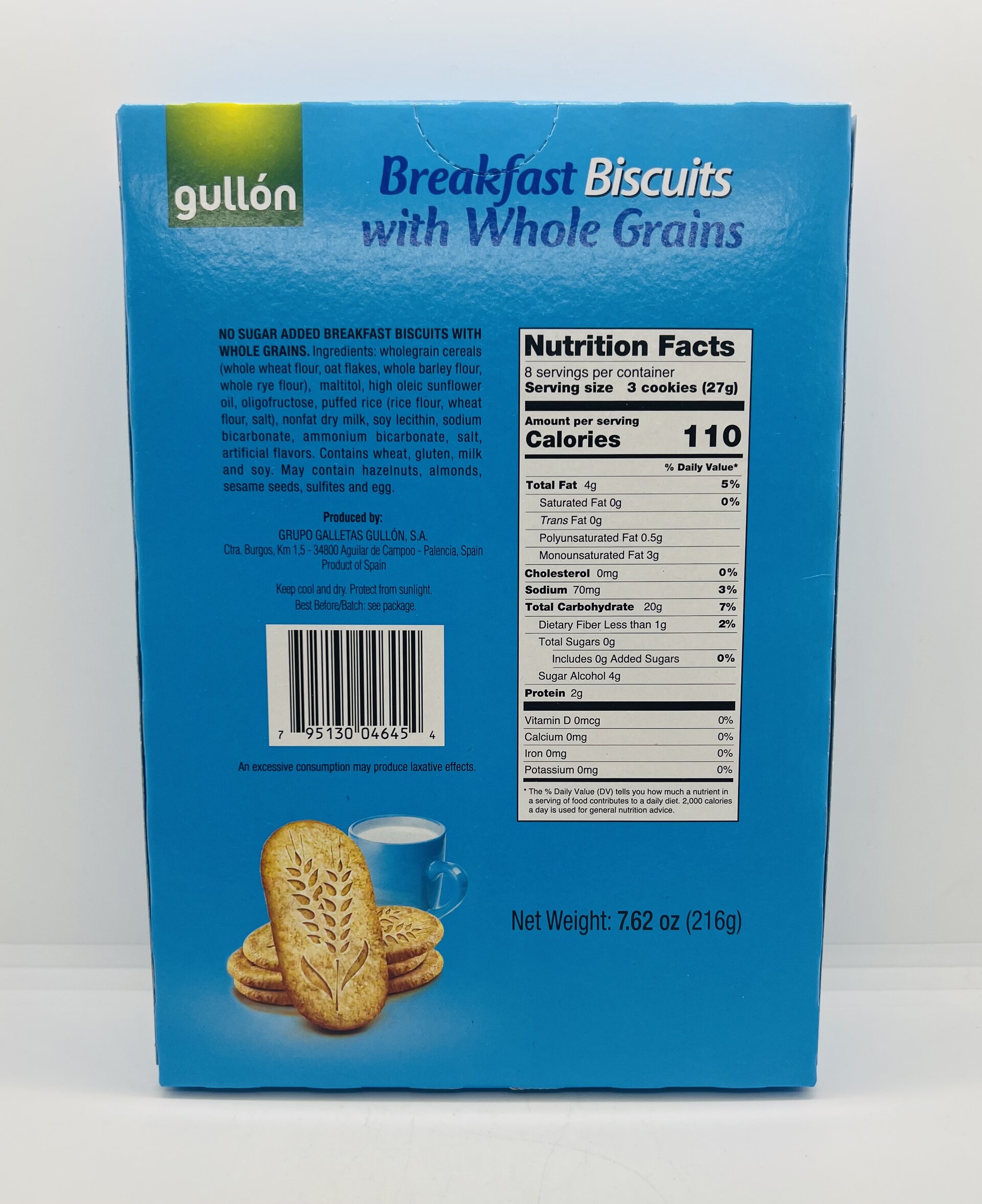 NO SUGAR ADDED BREAKFAST BISCUITS WITH WHOLE GRAINS. Ingredients: wholegrain cereals (whole wheat flour, oat flakes, whole barley flour, whole rye flour), maltitol, high oleic sunflower oil, oligofructose, puffed rice (rice flour, wheat flour, salt), nonfat dry milk, soy lecithin, sodium bicarbonate, ammonium bicarbonate, salt, artificial flavors. Contains wheat, gluten, milk and soy. May contain hazelnuts, almonds, sesame seeds, sulfites and egg.