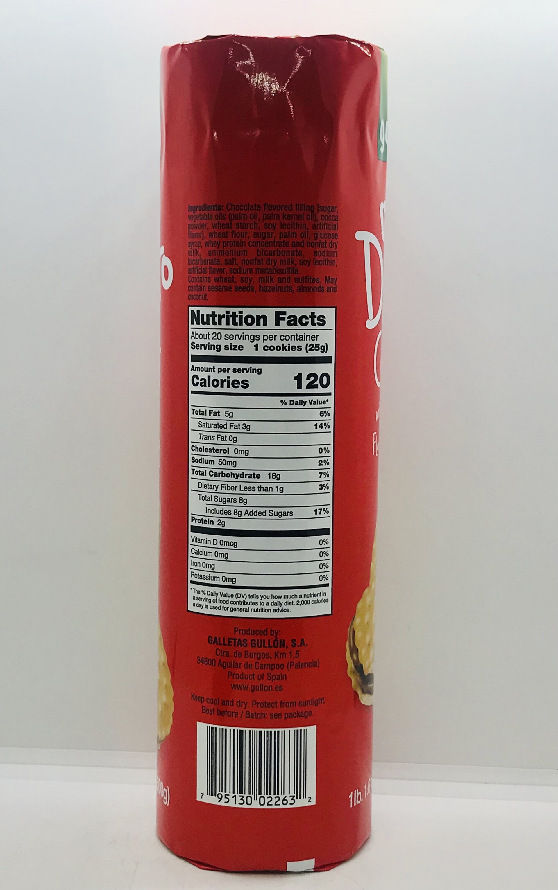 Chocolate flavored filling [sugar, vegetable oils (palm oil, palm kernel oil), cocoa powder, wheat starch, soy lecithin, artificial flavor], wheat flour, sugar, palm oil, glucose syrup, whey protein concentrate and nonfat dry milk, ammonium bicarbonate, sodium bicarbonate, salt, nonfat dry milk, soy lecithin, artificial flavor, sodium metabisulfite.