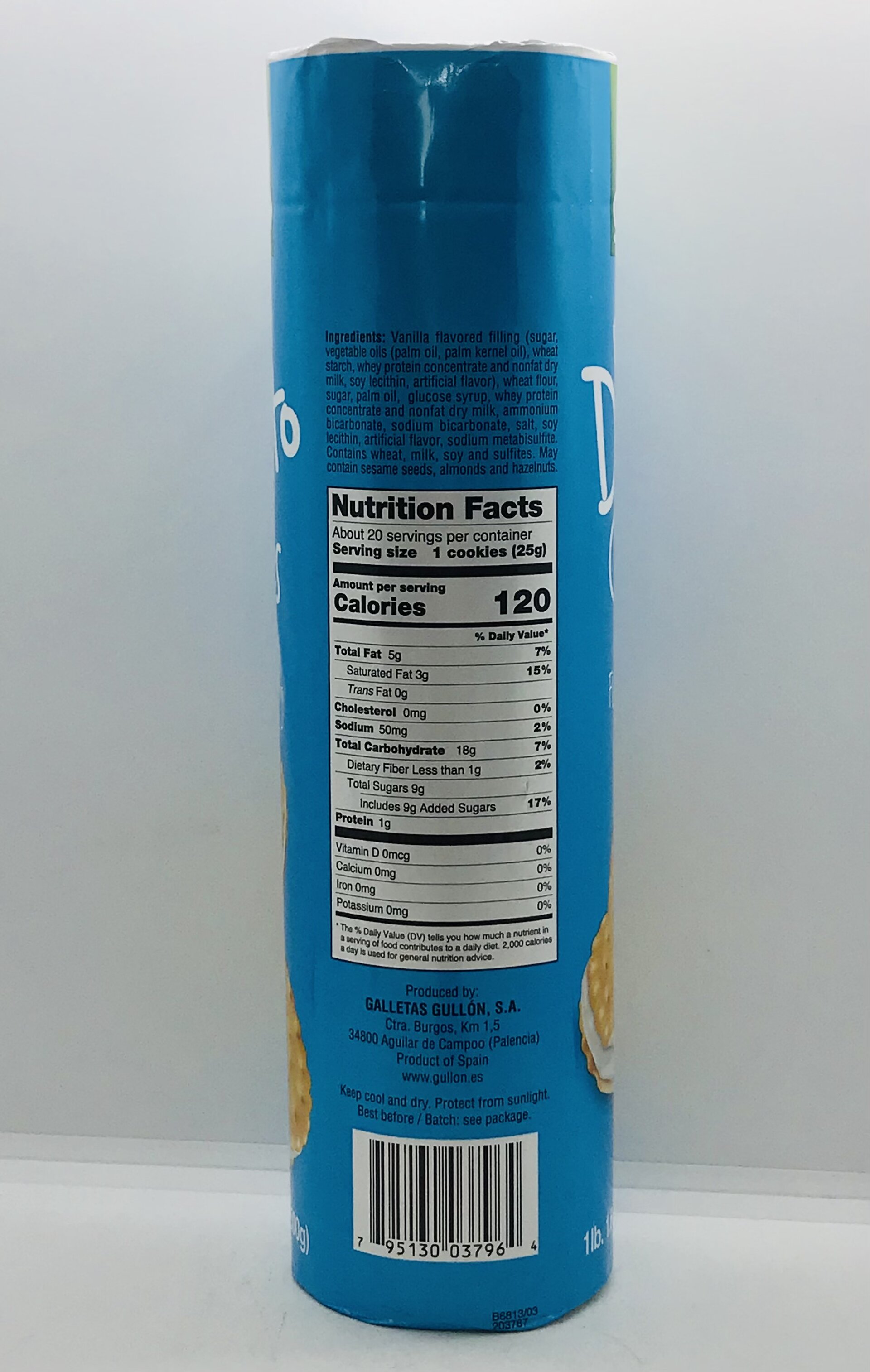Vanilla flavored filling (sugar, vegetable oils (palm oil, palm kernel oil), wheat starch, whey protein concentrate and nonfat dry milk, soy lecithin, artificial flavor), wheat flour, sugar, palm oil, glucose syrup, whey protein concentrate and nonfat dry milk, ammonium bicarbonate, sodium bicarbonate, salt, soy lecithin, artificial flavor, sodium metabisulfite.