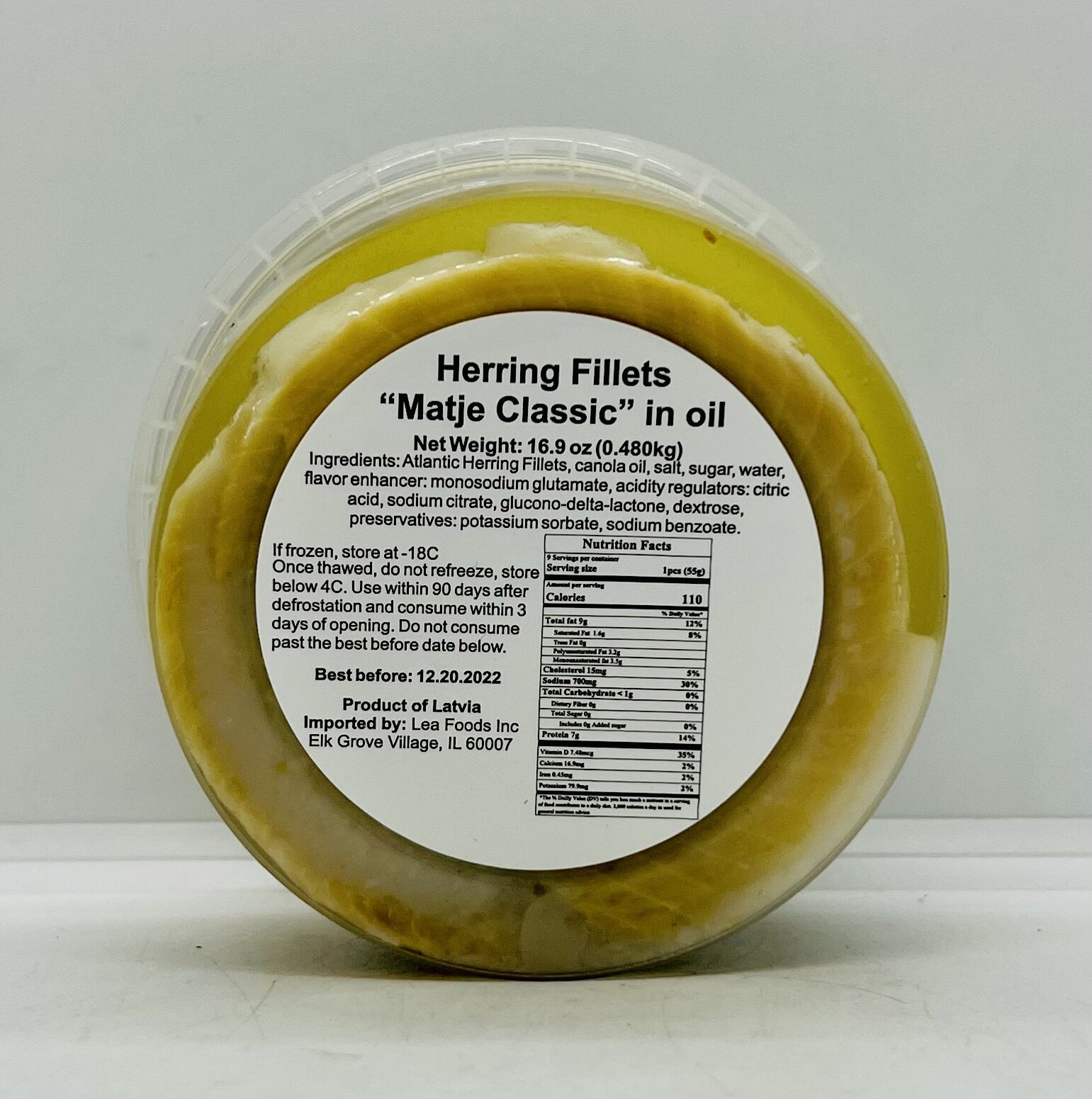 Atlantic Herring Fillets, canola oil, salt, sugar, water, flavor enhancer: monosodium glutamate, acidity regulators: citric acid, sodium citrate, glucono-delta-lactone, dextrose, preservatives: potassium sorbate, sodium benzoate.