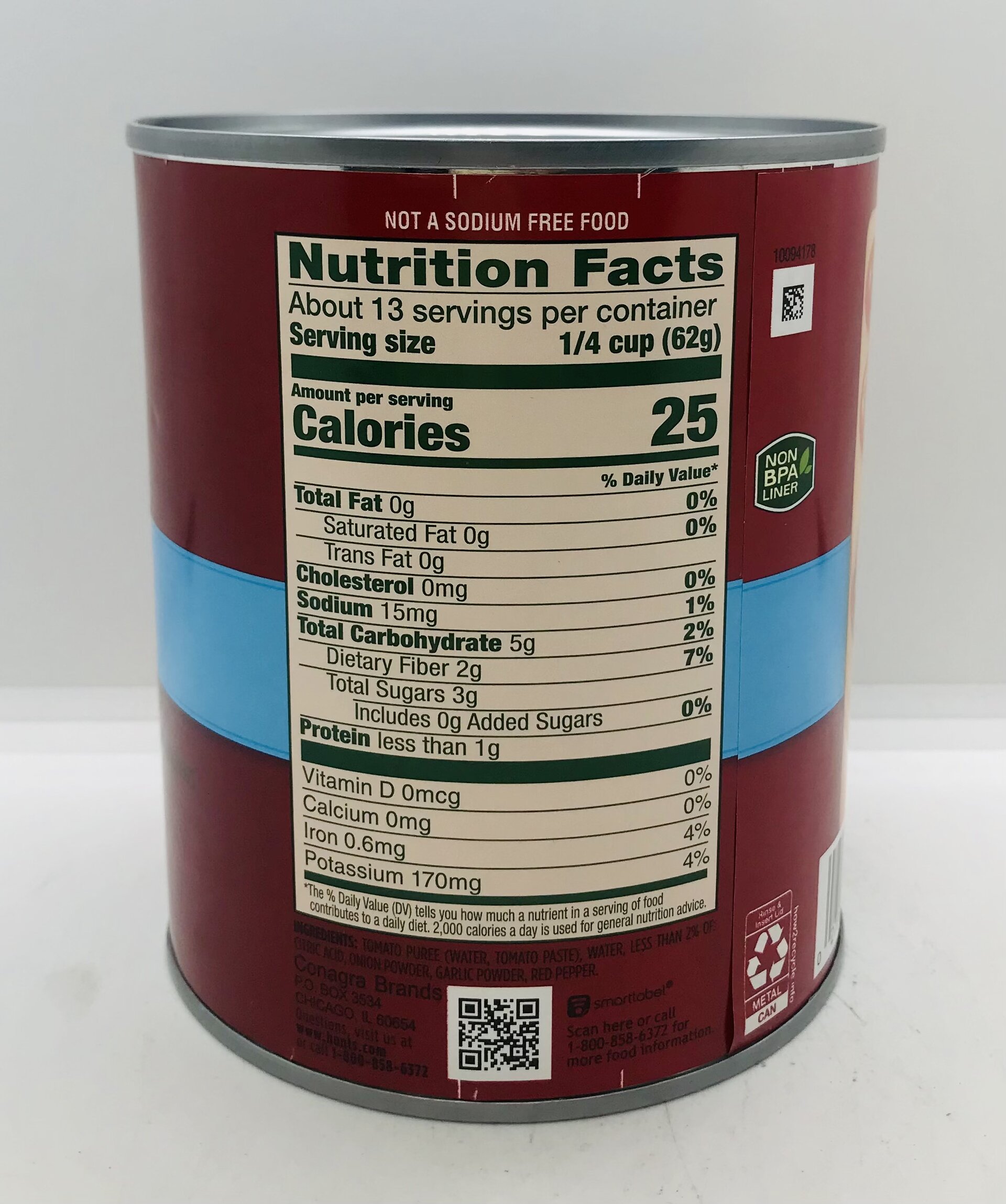 Tomato puree (water, tomato paste), water, less than 2% of: citric acid, onion powder, garlic powder, red pepper.