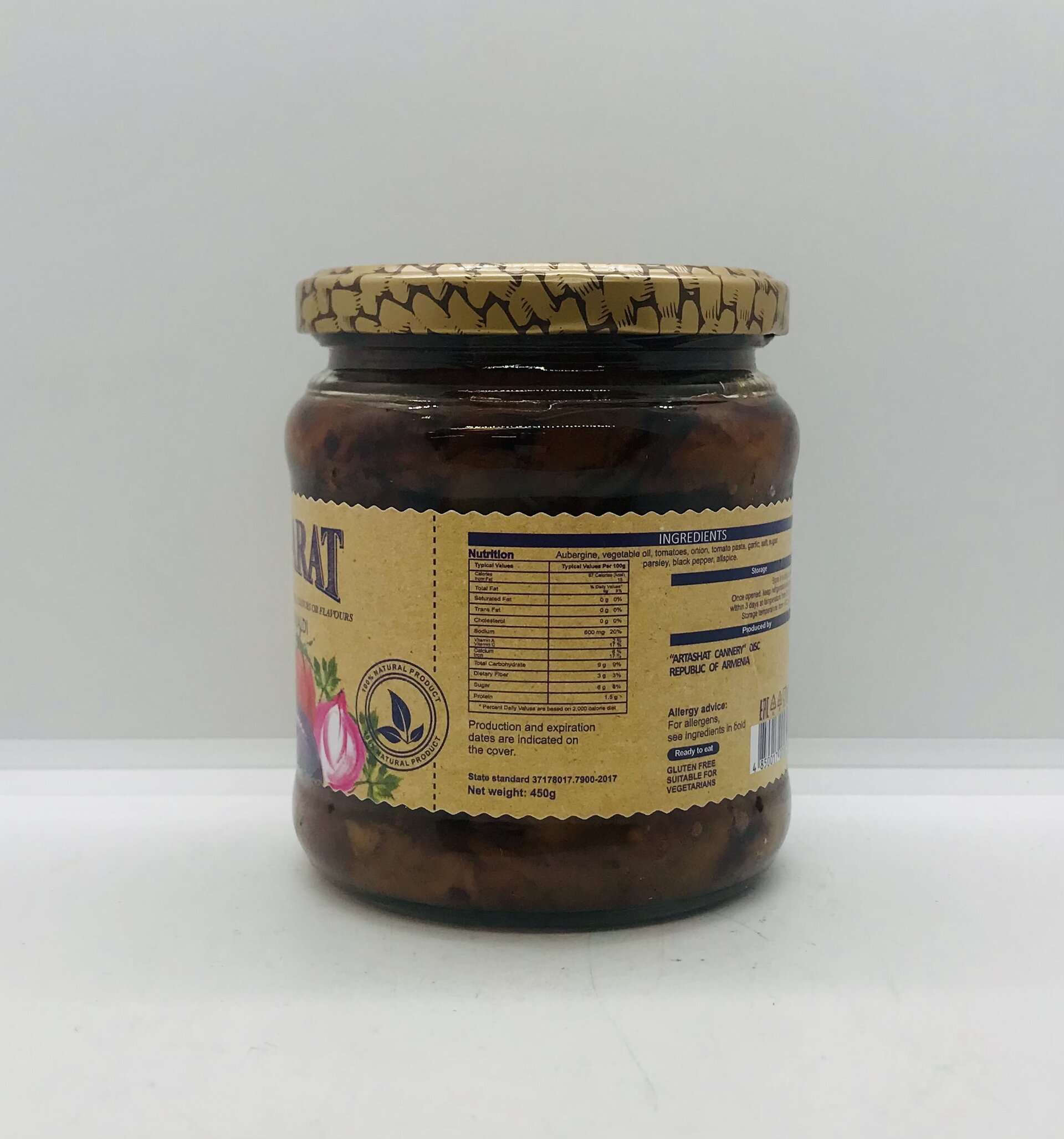 Aubergine, vegetable oil, tomatoes, onion, tomato paste, garlic, salt, sugar, parsley, black pepper, allspice.