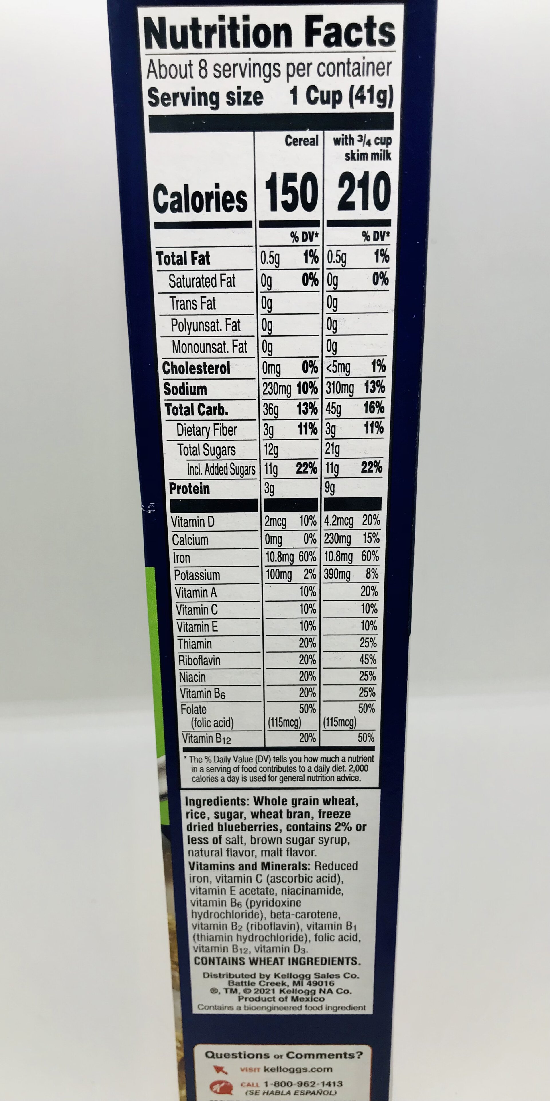 Whole grain wheat, rice, sugar, wheat bran, freeze dried blueberries contains 2% or less of brown sugar syrup, salt, natural flavor, malt flavor.