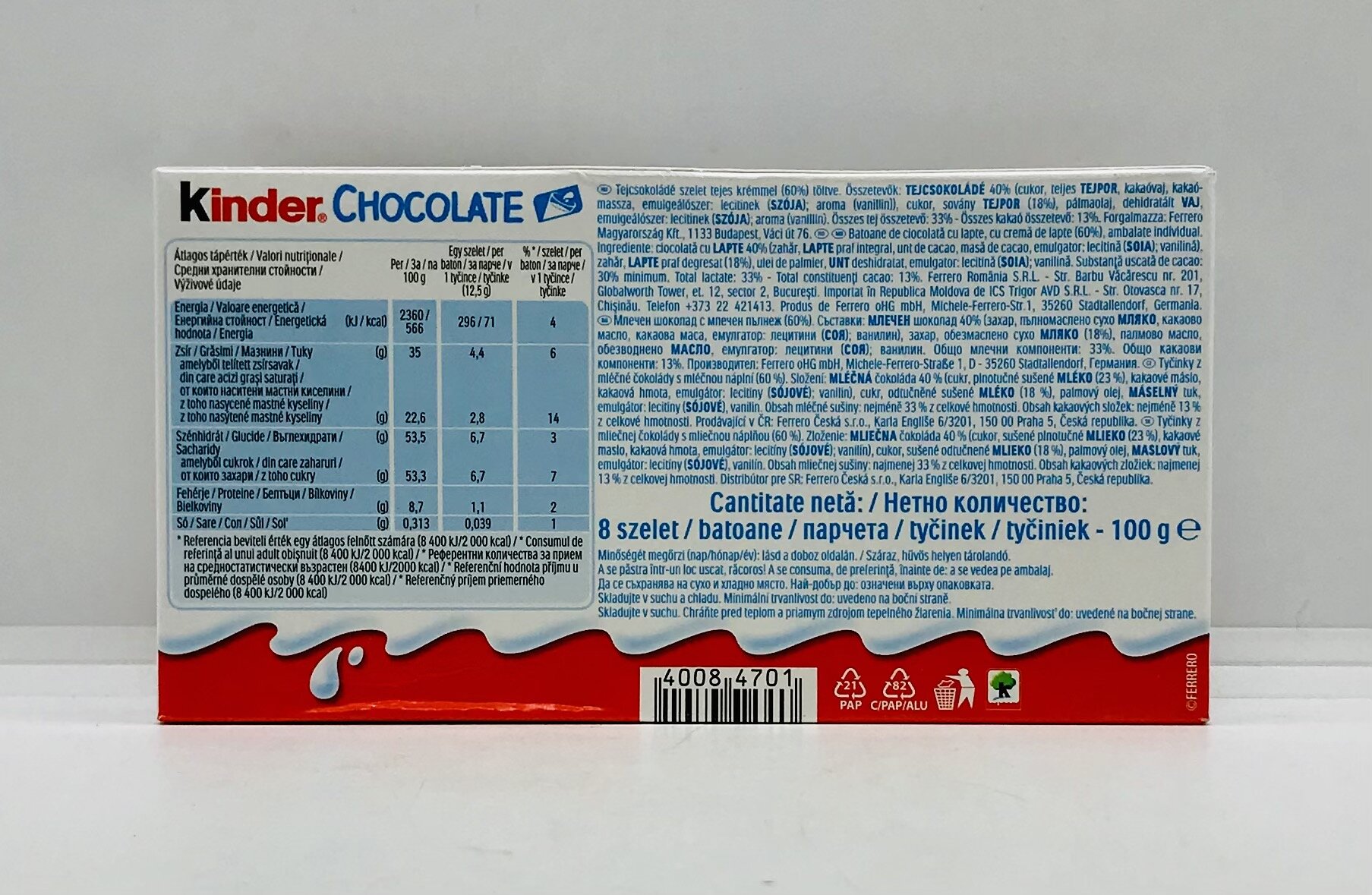 Milk Chocolate (40%) (Sugar, Milk Powder, Cocoa Butter, Cocoa Mass, Emulsifiers: Lecithin (Soy), Flavoring: Vanillin), Sugar, Skimmed Milk Powder, Vegetable Fat (Palm), Anhydrous Milkfat, Emulsifiers (Lecithin (Soy)), Flavoring (Vanillin). Total Milk Constituents: 33%, Total Cocoa Solids: 13%.