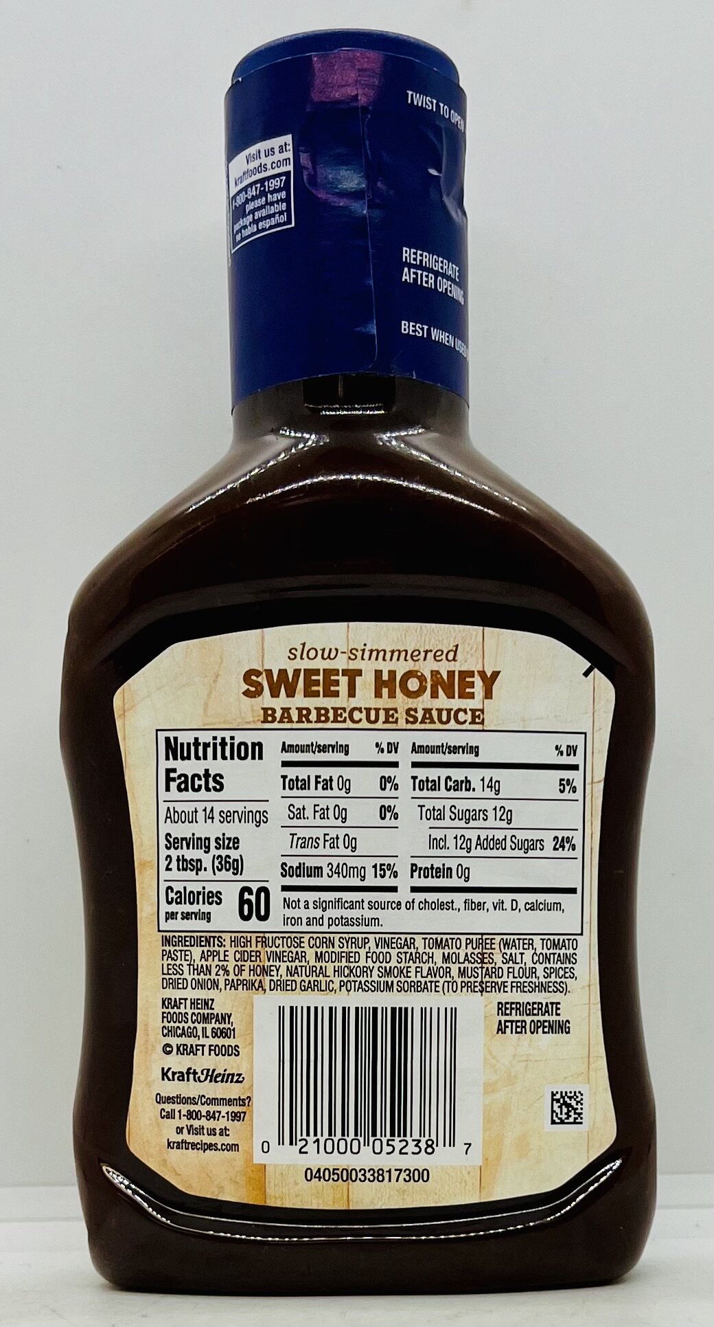 HIGH FRUCTOSE CORN SYRUP, VINEGAR, TOMATO PUREE (WATER, TOMATO PASTE) MOLASSES, APPLE CIDER VINEGAR, MODIFIED FOOD STARCH, SALT, CONTAINS LESS THAN 2% OF NATURAL HICKORY SMOKE FLAVOR, MUSTARD FLOUR, CHIPOTLE CHILI PEPPER", ONION, SPICES, PAPRIKA, GARLIC, NATURAL FLAVOR, POTASSIUM SORBATE (TO PRESERVE FRESHNESS).