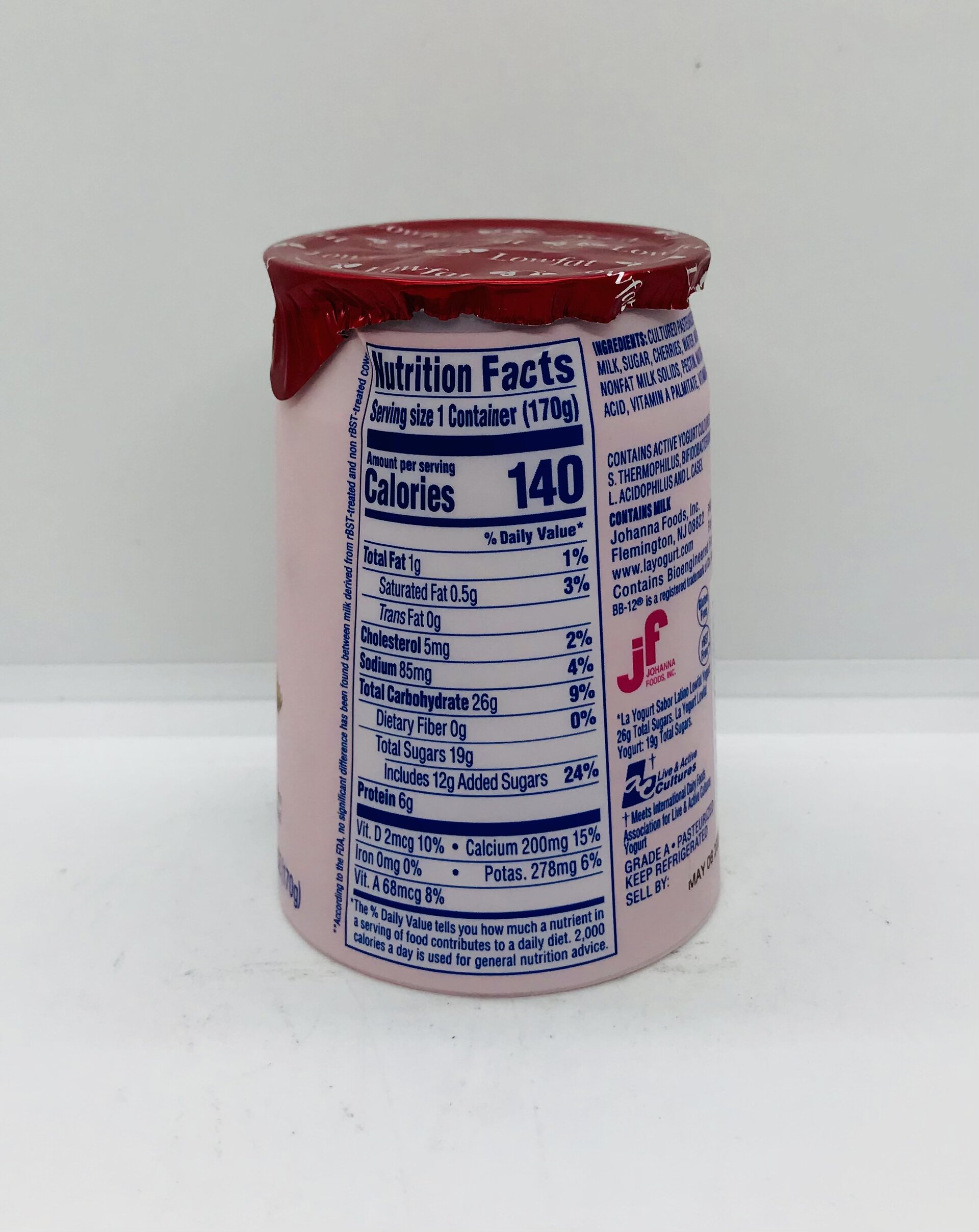 Cultured pasteurized grade A lowfat milk, sugar, cherries, water, modified cornstarch, nonfat milk solids, pectin, natural flavors, citric acid, vitamin A palmitate, vitamin D3.