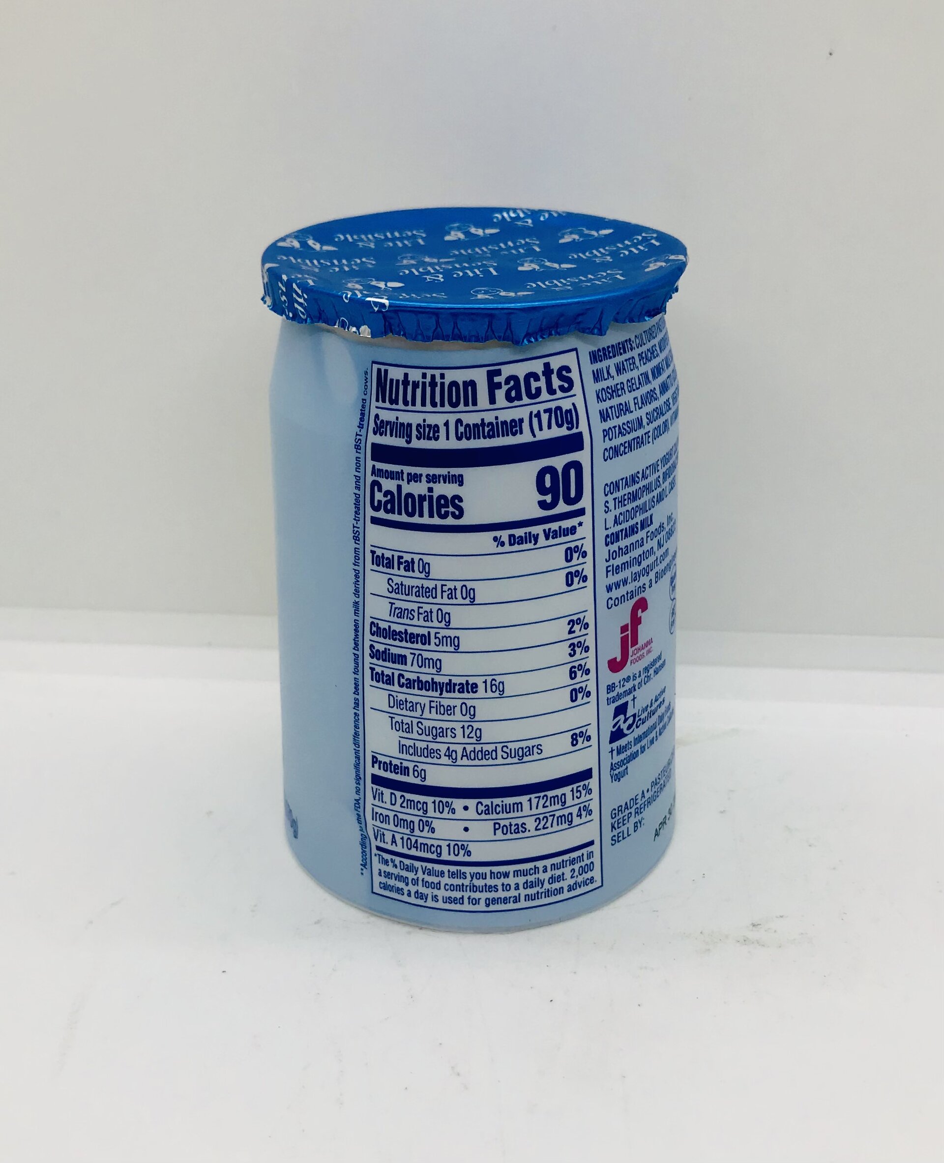 Cultured pasteurized grade A nonfat milk, water, peaches, modified corn starch, fructose, kosher gelatin, natural flavors, nonfat milk solids, citric acid, Annatto, acesulfame potassium, sucralose, vegetable juice concentrate, vitamin A palmitate, vitamin D3.
