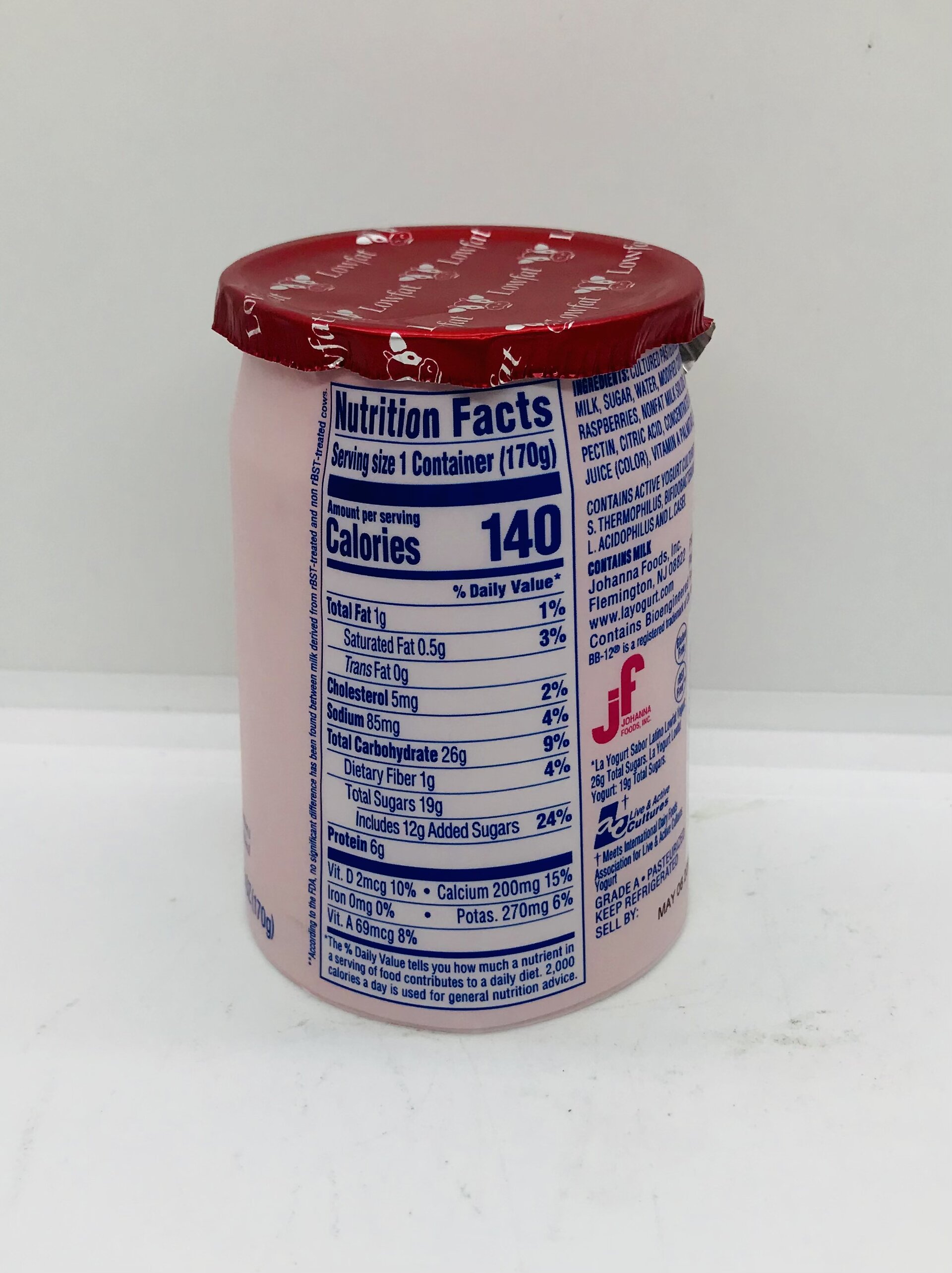 , Cultured pasteurized grade A lowfat milk, sugar, water, modified cornstarch, raspberries, nonfat milk solids, pectin, natural flavors, citric acid, concentrated elderberry juice, vitamin A palmitate, vitamin D3.