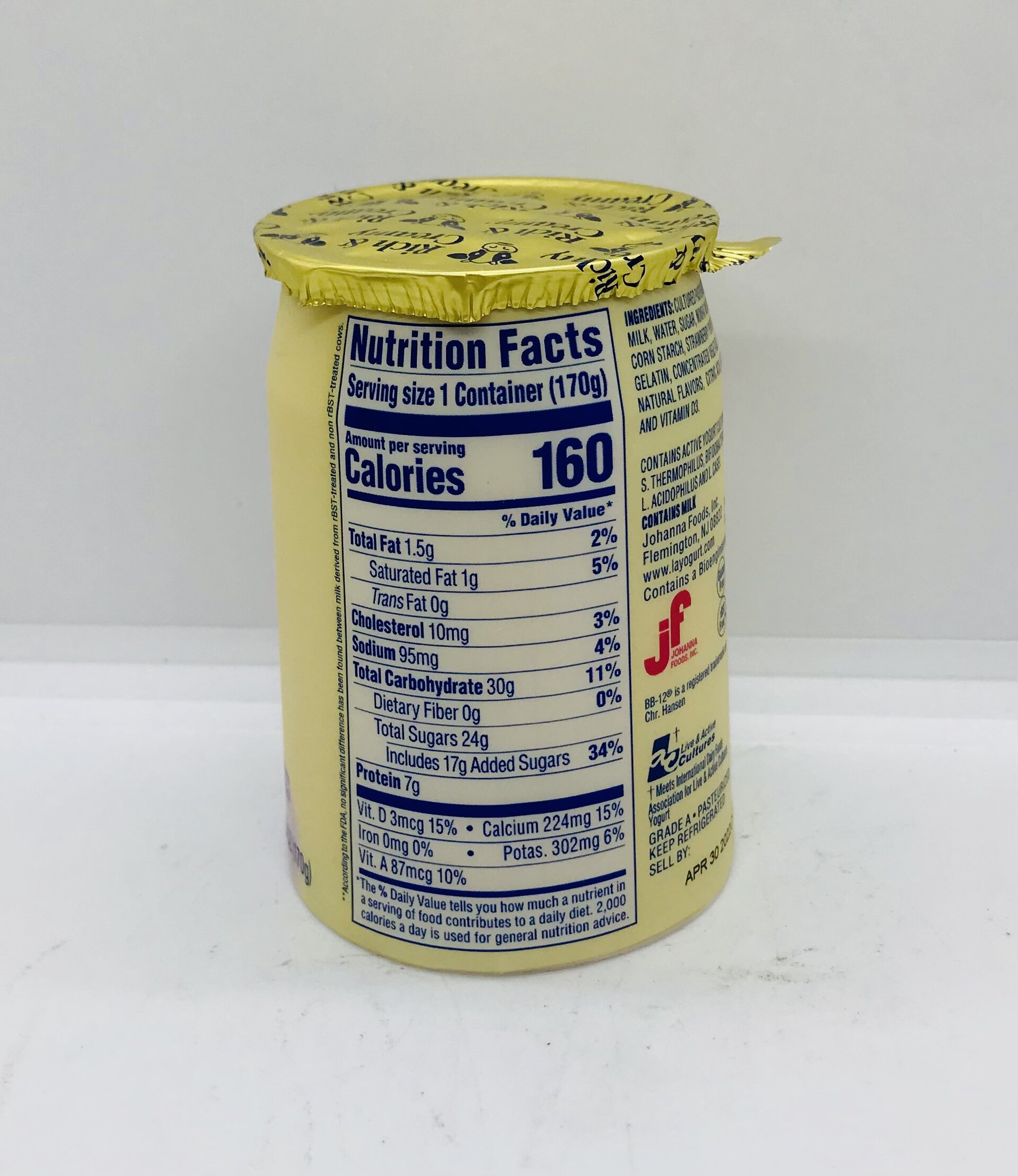 Cultured pasteurized grade A lowfat milk, sugar, water, nonfat milk solids, modified corn starch, strawberry puree, fructose, kosher gelatin, concentrated vegetable juice, natural flavors, citric acid, Vitamin A palmitate, vitamin D3.