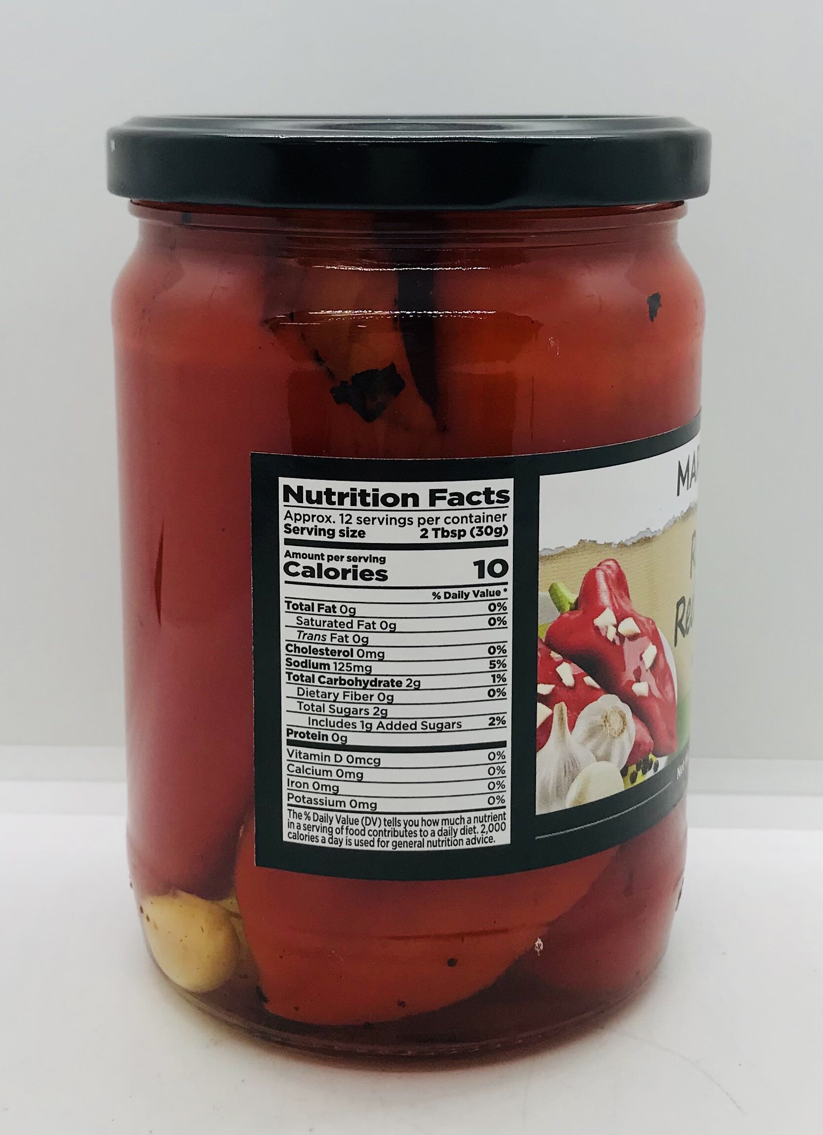 Roasted red pepper, water, sugar, vinegar, salt, garlic, garlic flavor.