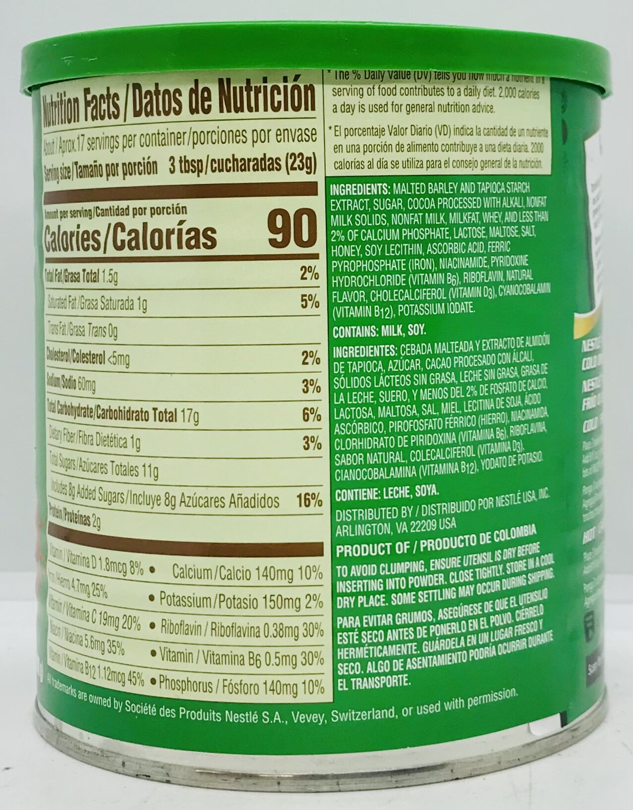 Malted barley and tapioca starch extract, sugar, cocoa processed with alkali, nonfat milk solids, nonfat milk, milkfat, whey, and less than 2% of calcium phosphate, lactose, maltose, salt, honey, soy lecithin, ascorbic acid, ferric pyrophosphate (iron), niacinamide, pyridoxine hydrochloride (vitamin B6), riboflavin, natural flavor, cholecalciferol (vitamin D3), cyanocobalamin (vitamin B12), potassium iodate.