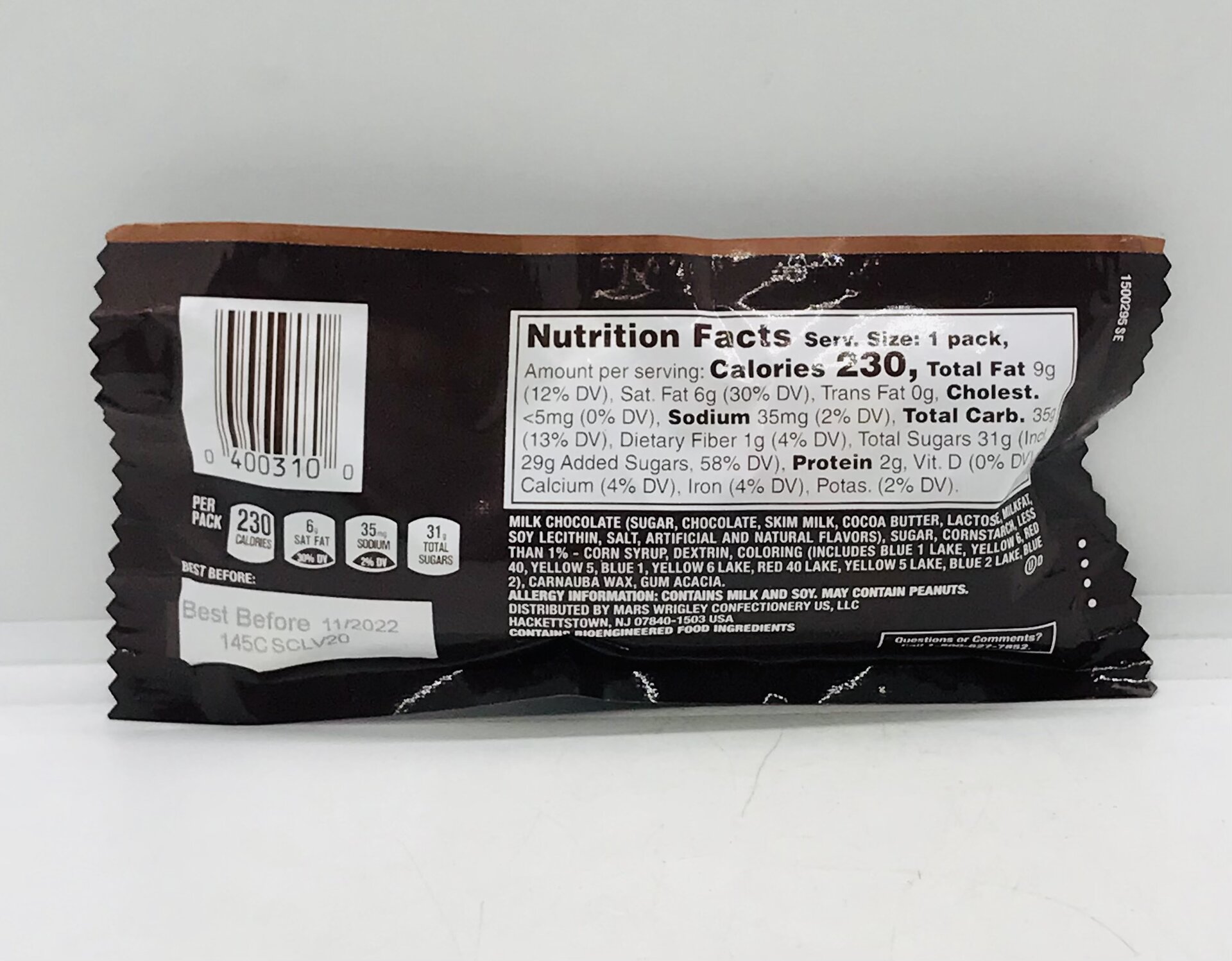 MILK CHOCOLATE (SUGAR, CHOCOLATE, SKIM MILK, COCOA BUTTER, LACTOSE, MILKFAT, SOY LECITHIN, SALT, ARTIFICIAL AND NATURAL FLAVORS), SUGAR, CORNSTARCH, LESS THAN 1%-CORN SYRUP, DEXTRIN, COLORING (INCLUDES BLUE 1 LAKE, YELLOW 6, RED 40, YELLOW 5, BLUE 1, YELLOW 6 LAKE, RED 40 LAKE, YELLOW 5 LAKE, BLUE 2 LAKE, BLUE 2). CARNAUBA WAX, GUM ACACIA.