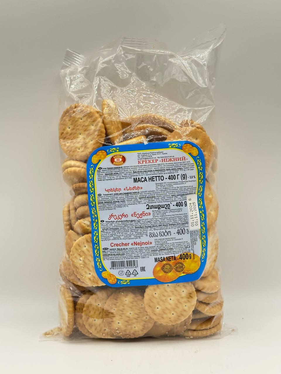Top grade wheat flour, margarine (refined deodorized palm oil, drinking water, common edible salt, emulsifiers (E 471, E475, E 322), dye (E 160a), flavor, preservative (E 200), acidity regulator (E 270)), sunflower oil, sugar, invert sugar syrup, raising agent: ammonium hydrogen carbonate, sodium carbonate; salt, acidity regulator: citric acid; antioxidant: sodium metabisulfite May contain traces of milk products, egg products, nuts, peanuts, sesame.