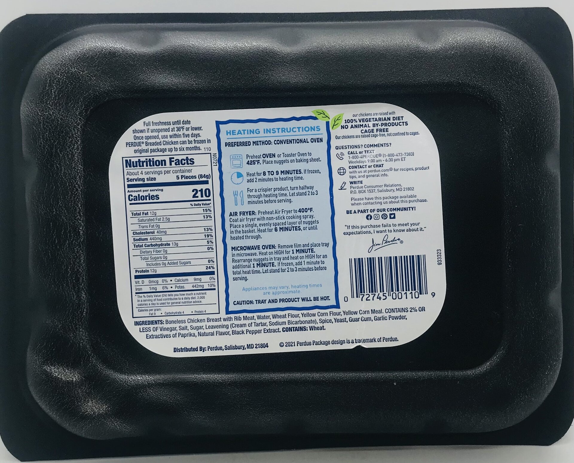 Boneless Chicken Breast with Rib Meat, Water, Wheat Flour, Yellow Com Flour, Yellow Can Meal. CONTAINS 2% OR LESS OF Vinegar, Salt, Sugar, Leavening (Cream of Tartar, Sodium Bicarbonate), Spice, Yeast, Guar Cum, Garlic Powder, Extractives of Paprika, Natural Flavor, Black Pepper Extract,