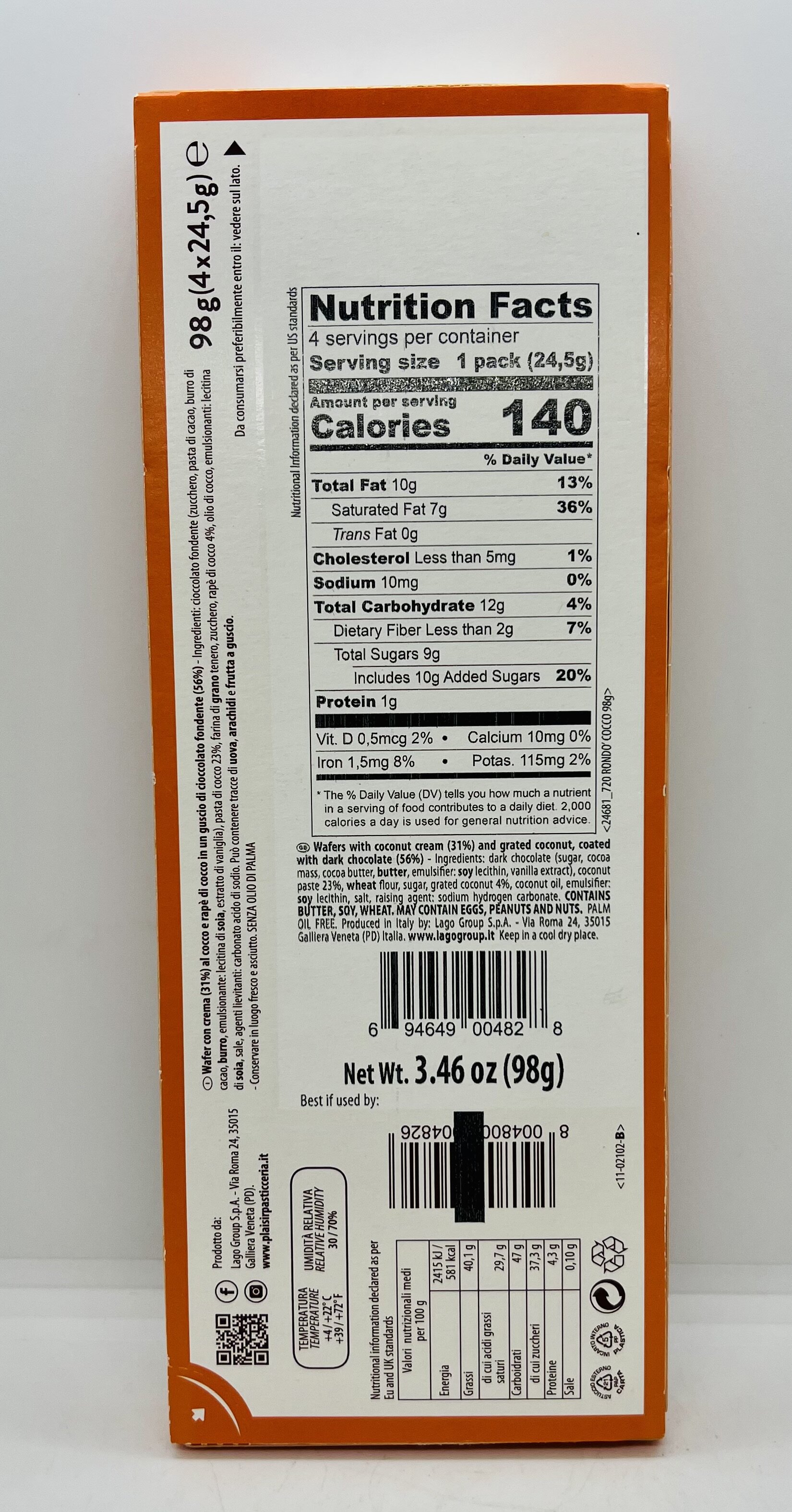 Wafers with coconut cream (31%) and grated coconut, coated with dark chocolate (56%) Ingredients: dark chocolate (sugar, cocoa mass, cocoa butter, butter, emulsifier: soy lecithin, vanilla extract), coconut paste 23%, wheat flour, sugar, grated coconut 4%, coconut oil, emulsifier: soy lecithin, salt, raising agent: sodium hydrogen carbonate.