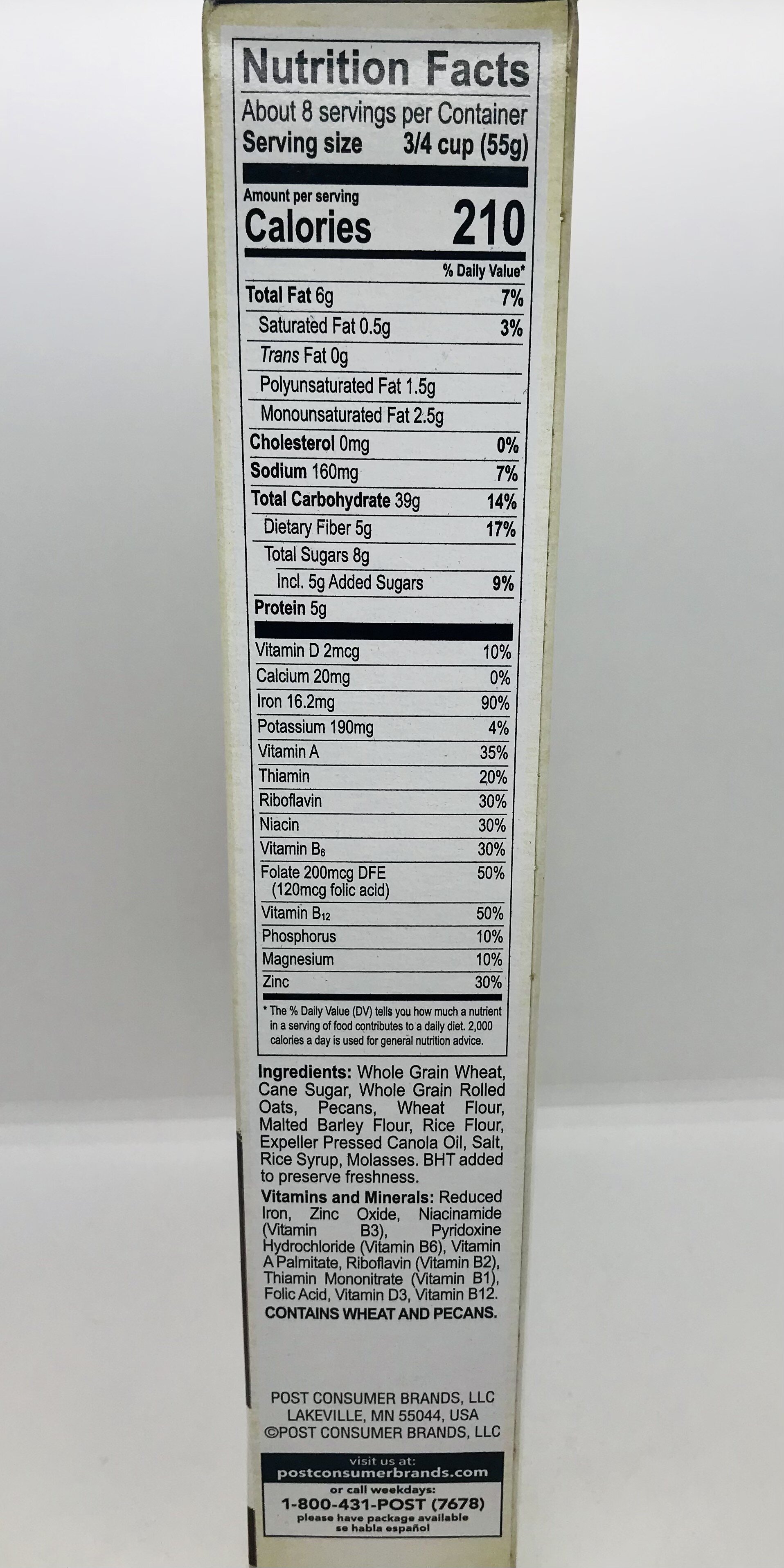 Whole grain wheat, cane sugar, whole grain rolled oats, pecans, wheat flour, malted barley flour, rice flour, expeller pressed canola oil, salt, rice syrup, molasses. BHT added to preserve freshness.
