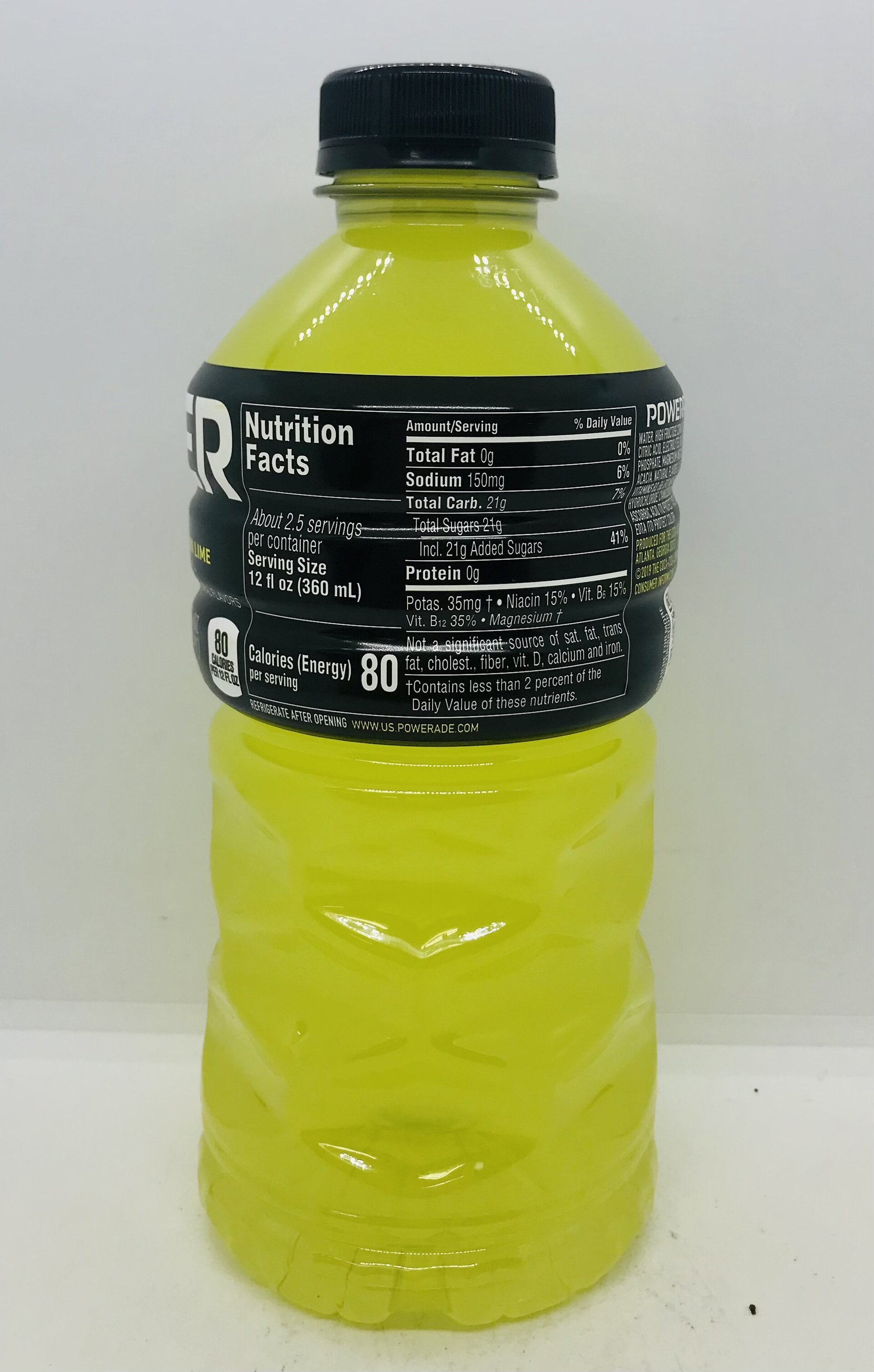 WATER, HIGH FRUCTOSE CORN SYRUP, LESS THAN 0.5% OF: CITRIC ACID, ELECTROLYTES (SALT, MONO-POTASSIUM PHOSPHATE, MAGNESIUM AND CALCIUM CHLORIDES), GUM ACACIA, NATURAL FLAVORS, GLYCEROL ESTER OF ROSIN, VITAMINS B3, B6, B12 (NIACINAMIDE, PYRIDOXINE HYDROCHLORIDE, CYANOCOBALAMIN), YELLOW 5, ASCORBIC ACID (TO PROTECT TASTE), CALCIUM DISODIUM EDTA (TO PROTECT COLOR).