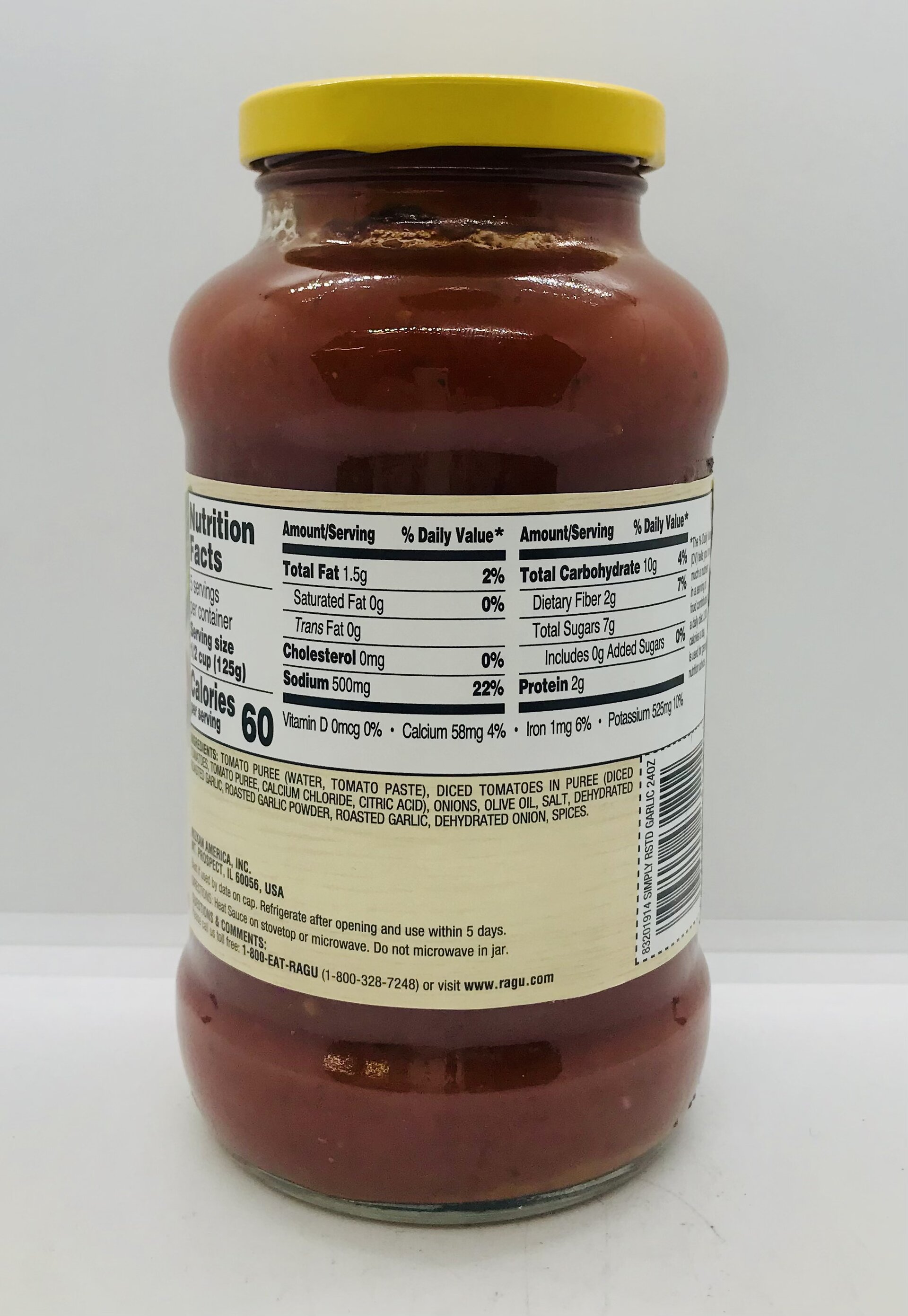 Tomato puree (water, tomato paste), diced tomatoes in puree (diced tomatoes, tomato puree, calcium chloride, citric acid), onions, olive oil, salt, dehydrated roasted garlic, roasted garlic powder, roasted garlic, dehydrated onion, spices.