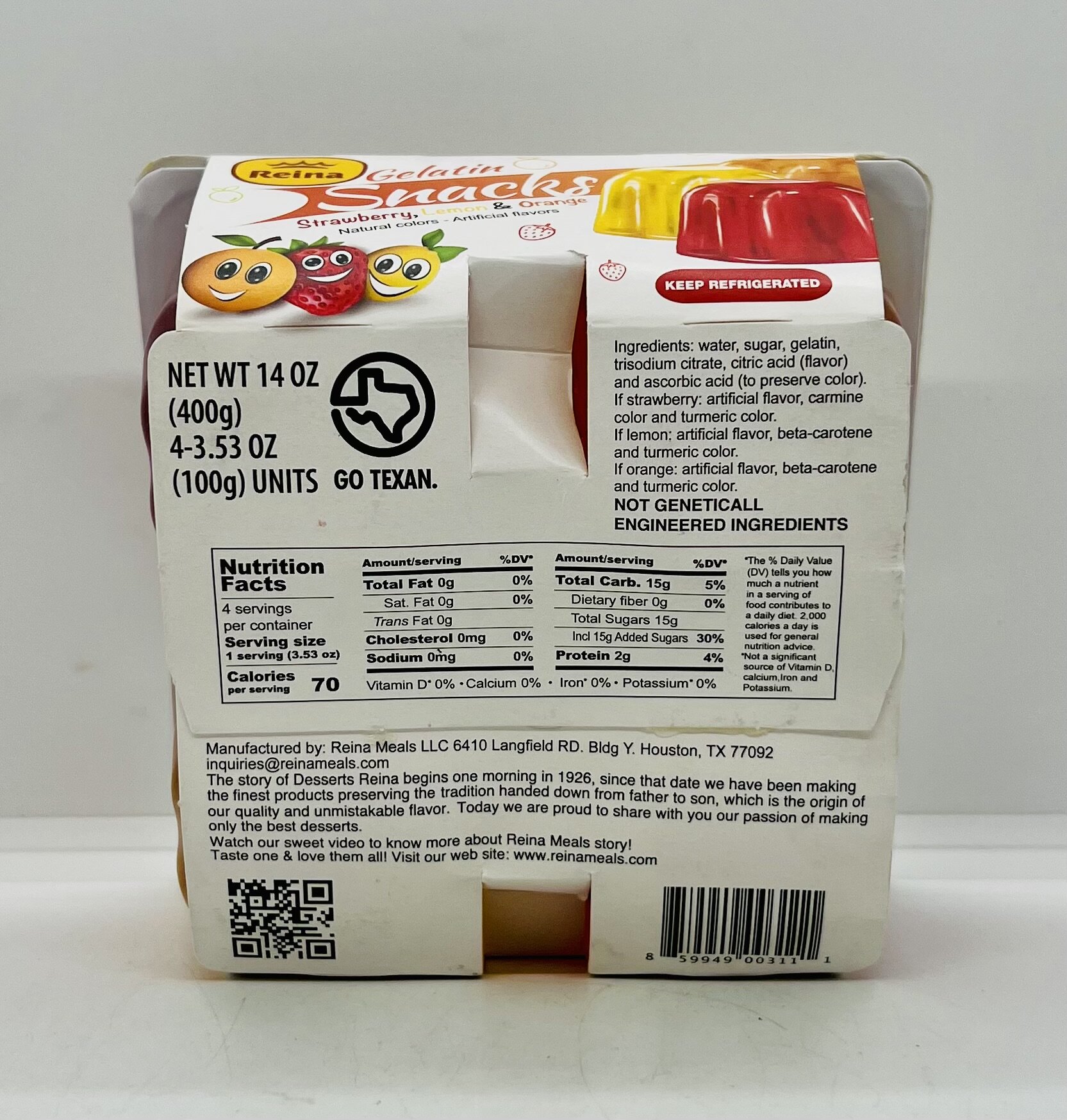 water, sugar, gelatin, trisodium citrate, citric acid (flavor) and ascorbic acid (to preserve color). If strawberry: artificial flavor, carmine color and turmeric color.