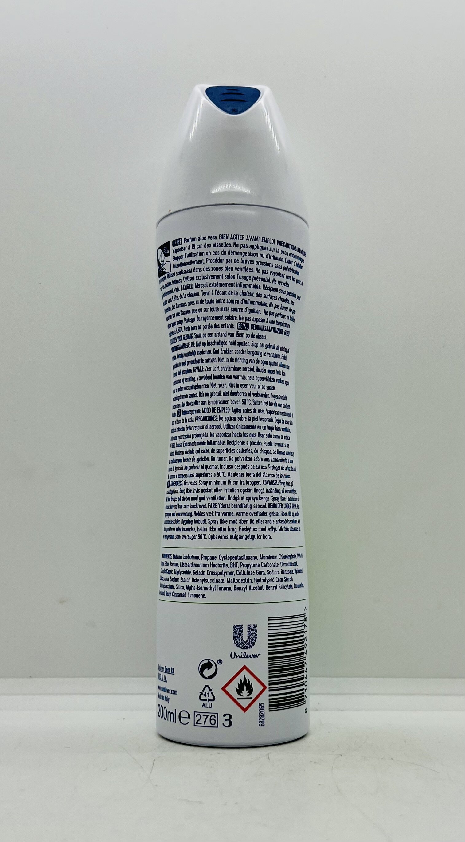 Butane, Isobutane, propane, cyclopentasiloxane, aluminum chlorohydrate, PPG-14 Butyl ether, parfum, disteardimonium hectorite, BHT.