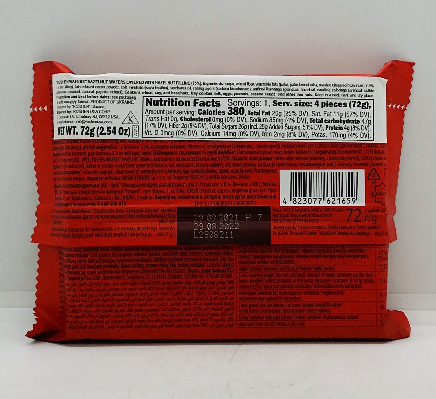 Sugar, wheat flour, vegetable fats, roasted chopped hazelnuts in the filling), fat-reduced cocoa powder, salt, emulsifier(soya lecithin), sunflower oil, raising agent (sodium bicarbonate), artificial flavorings (gianduja, hazelnut, vanillin), colorings (artificial: sulfite ammonia caramel, natural: paprika extract).