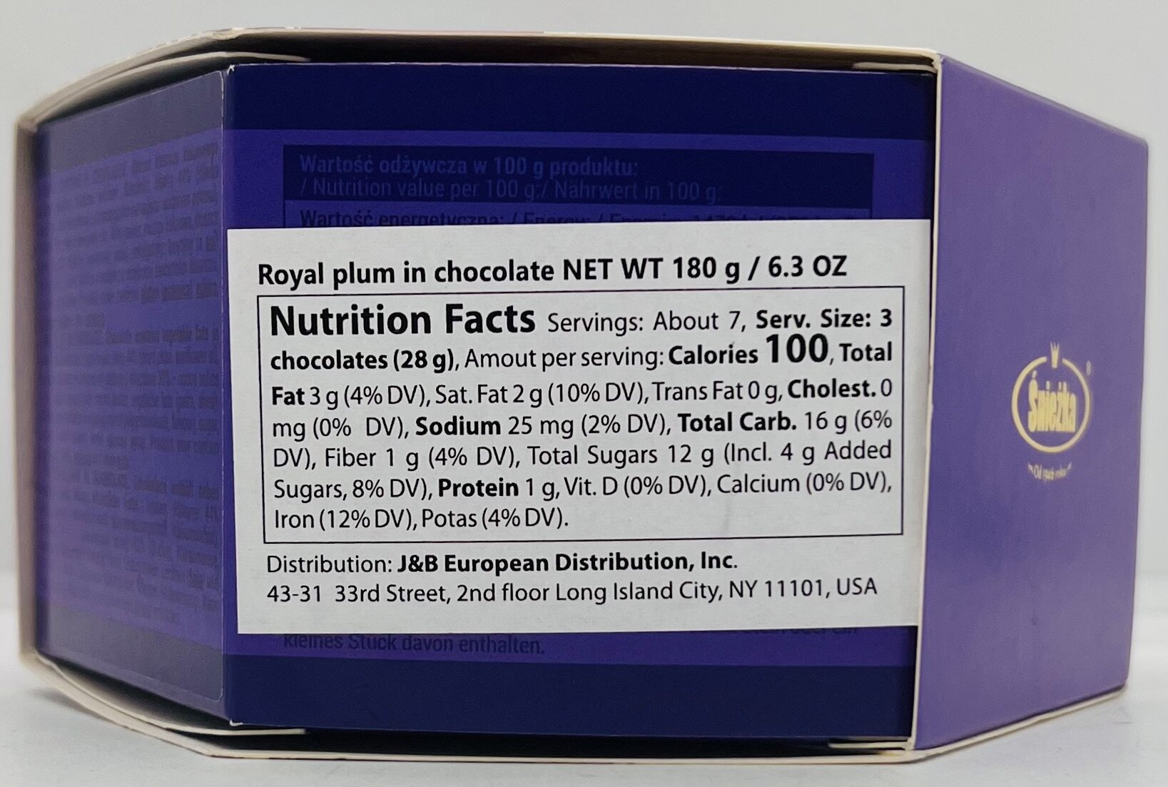 Plum 44% (dried plum, sunflower oil, preservative substance: potassium sorbate), chocolate 30% - cocoa solids 43% min. (sugar, cocoa pulp, cocoa butter, vegetable fats (palm, shea), emulsifiers: soy lecithin's and polyglycerol polygricinoleate, flavor), sugar, fat-reduced cocoa powder, water, glucose syrup.