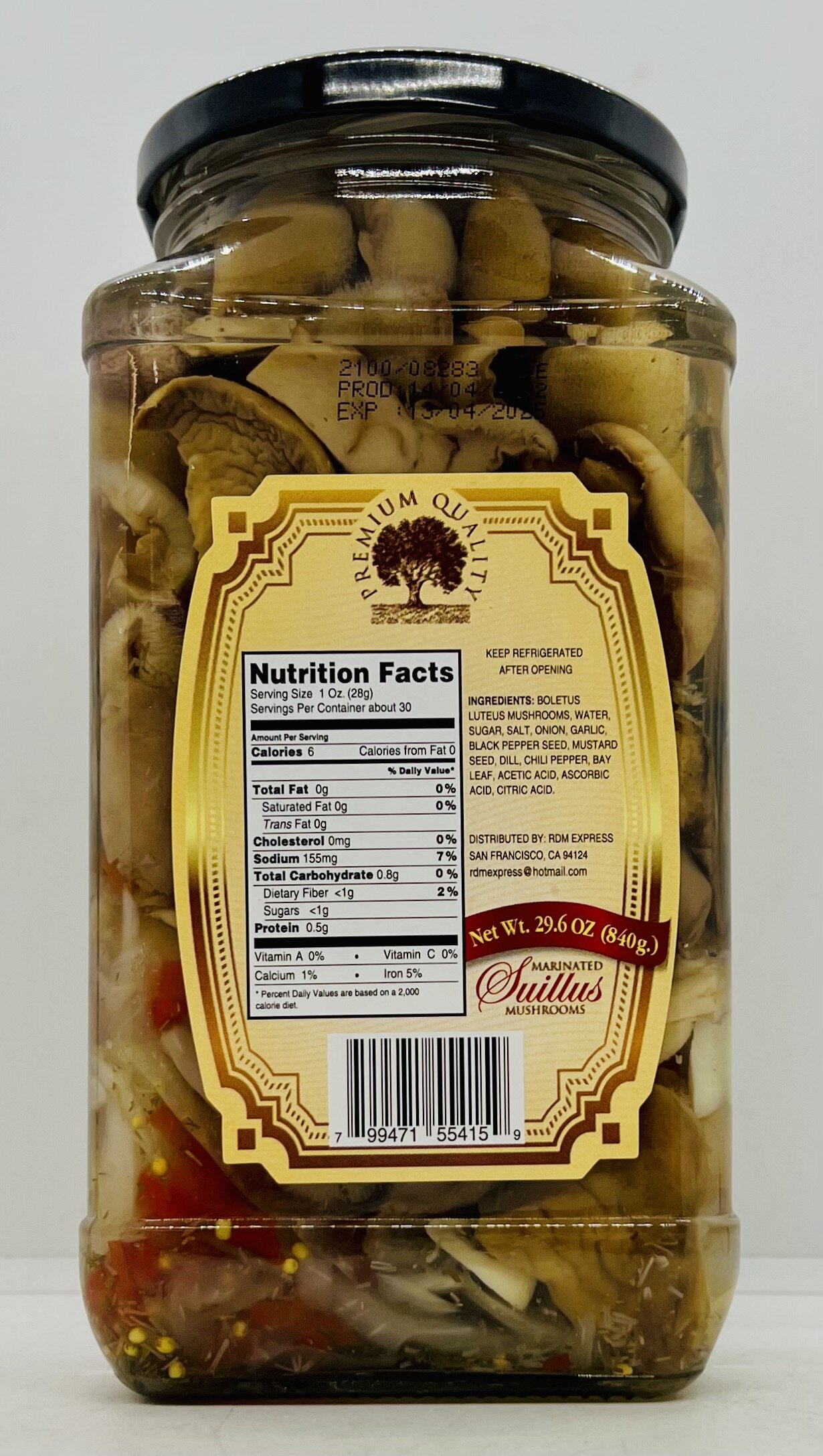 Boletus luteus mushrooms, water, sugar, salt, onion, garlic, black pepper seed, mustard seed, dill, chili pepper, bay leaf, acetic acid, ascorbic acid, citric acid.