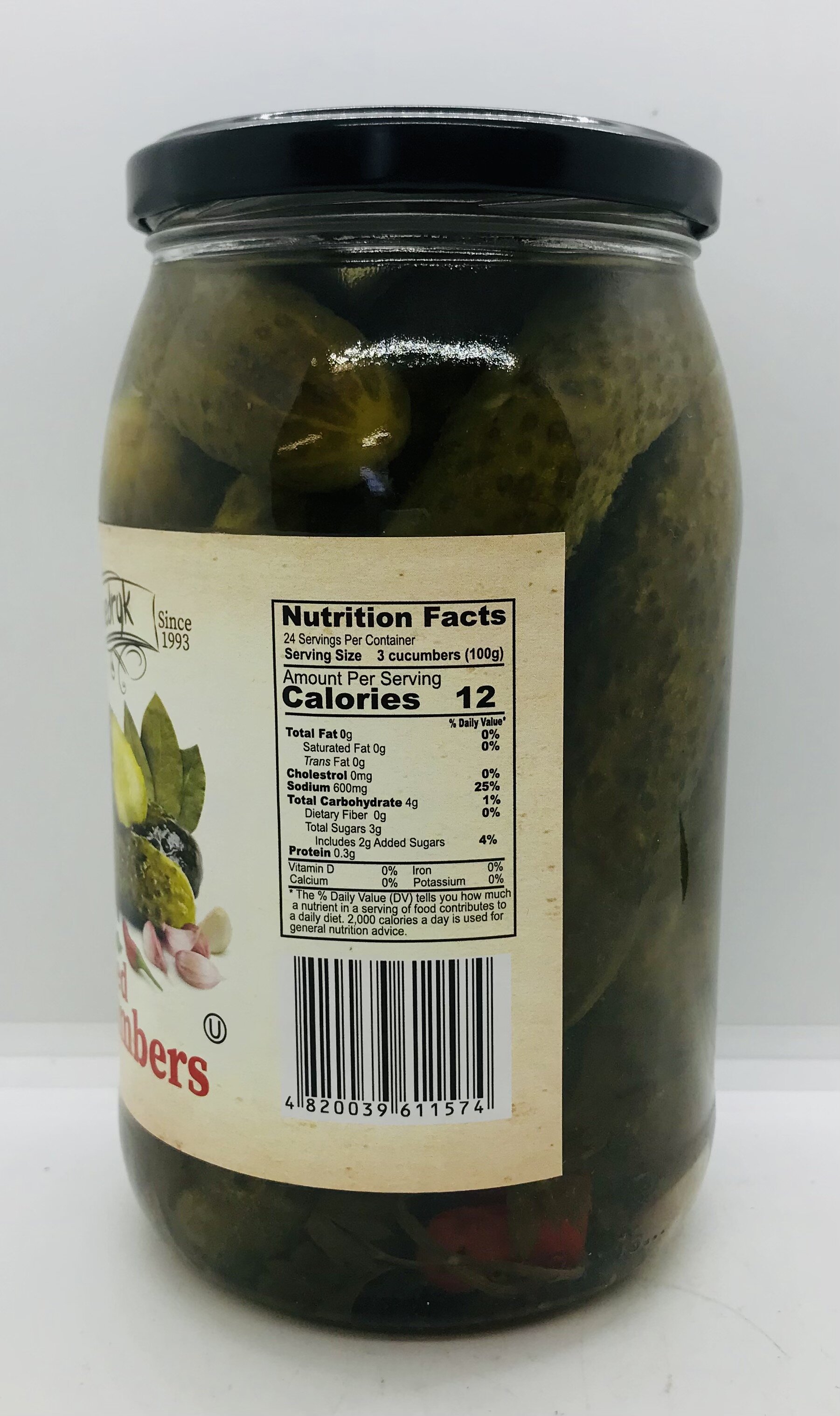 Cucumbers, water, sugar, salt, vinegar, horseradish, parsley, dill, garlic, black pepper, bay leaf, chili pepper.