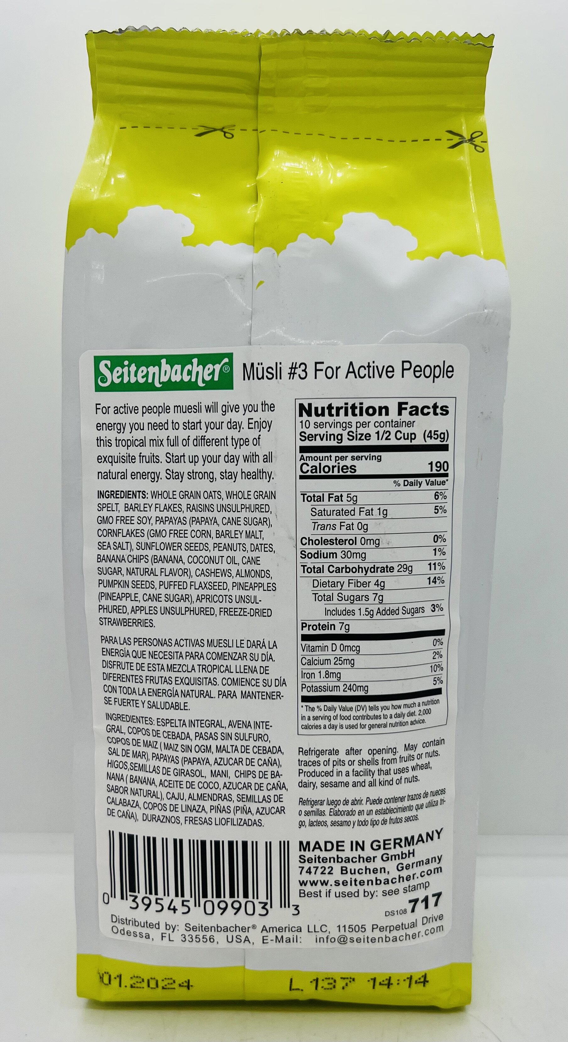 WHOLE GRAIN OATS, WHOLE GRAIN SPELT, BARLEY FLAKES, RAISINS UNSULPHURED, GMO FREE SOY, PAPAYAS (PAPAYA, CANE SUGAR), CORNFLAKES (GMO FREE CORN, BARLEY MALT, SEA SALT), SUNFLOWER SEEDS, PEANUTS, DATES, BANANA CHIPS (BANANA, COCONUT OIL, CANE SUGAR, NATURAL FLAVOR), CASHEWS, ALMONDS, PUMPKIN SEEDS, PUFFED FLAXSEED, PINEAPPLES (PINEAPPLE, CANE SUGAR), APRICOTS UNSUL PHURED, APPLES UNSULPHURED, FREEZE-DRIED STRAWBERRIES.