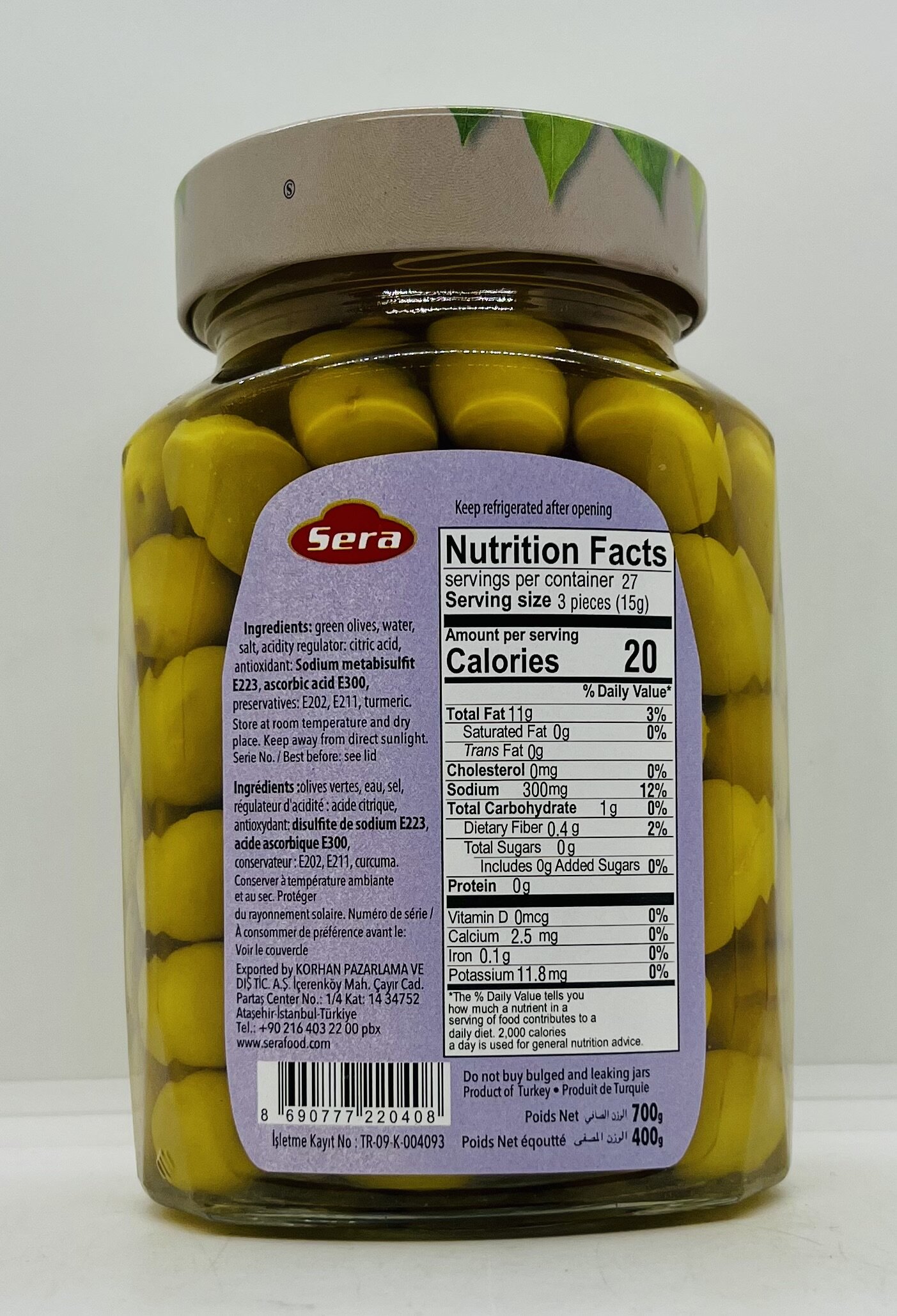Green olives, water, salt, acidity regulator: citric acid, antioxidant.